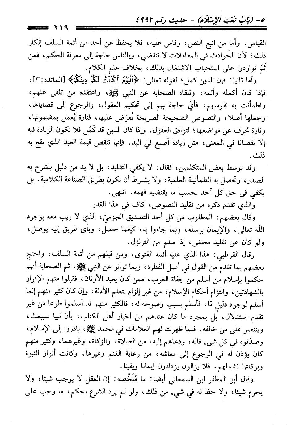وَقَالَ القرطبيّ: هَذَا الذي عليه أئمة الفتوى، ومن قبلهم منْ أئمة السلف، واحتج بعضهم بما تقدم منْ القول فِي أصل الفطرة، وبما تواتر عن النبيّ -صلى الله عليه وسلم-، ثم الصحابة أنهم حكموا بإسلام منْ أسلم منْ جفاة العرب، ممن كَانَ يعبد الأوثان، فقبلوا منهم الإقرار بالشهادتين، والتزام أحكام الإسلام، منْ غير إلزام بتعلم الأدلة، وإن كَانَ كثير منهم إنما أسلم لوجود دليلٍ ما، فأسلم بسبب وضوحه له، فالكثير منهم قد أسلموا طوعا منْ غير تقدم استدلال، بل بمجرد ما كَانَ عندهم منْ أخبار أهل الكتاب، بأن نبيا سيبعث، وينتصر عَلَى منْ خالفه، فلما ظهرت لهم العلامات فِي محمد -صلى الله عليه وسلم-، بادروا إلى الإسلام، وصدّقوه فِي كل شيء قاله، ودعاهم إليه، منْ الصلاة، والزكاة، وغيرهما، وكثير منهم كَانَ يؤذن له فِي الرجوع إلى معاشه، منْ رعاية الغنم وغيرها، وكانت أنوار النبوة وبركاتها تشملهم، فلا يزالون يزدادون إيمانا ويقينا.