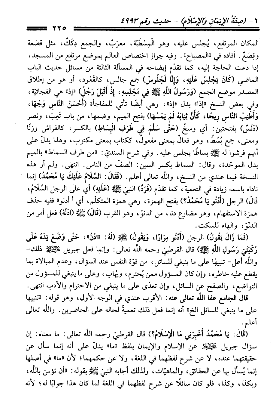 (قَالَ: يَا مُحَمَّدُ أَخْبِرْنِي مَا الإِسْلَامُ؟) قَالَ القرطبيّ رحمه الله تعالى: ما معناه: إن سؤال جبريل -عليه السلام- عن الإسلام والإيمان بلفظ "ما" يدلّ عَلَى أنه إنما سأل عن حقيقتهما عنده، لا عن شرح لفظهما فِي اللغة، ولا عن حكمهما؛ لأن "ما" فِي أصلها إنما يُسأل بها عن الحقائق، والماهيّات، ولذلك أجابه النبيّ -صلى الله عليه وسلم- بقوله: "أن تؤمن بالله، وبكذا، وكذا، فلو كَانَ سائلا عن شرح لفظهما فِي اللغة لما كَانَ هَذَا جوابًا له؛ لأنه