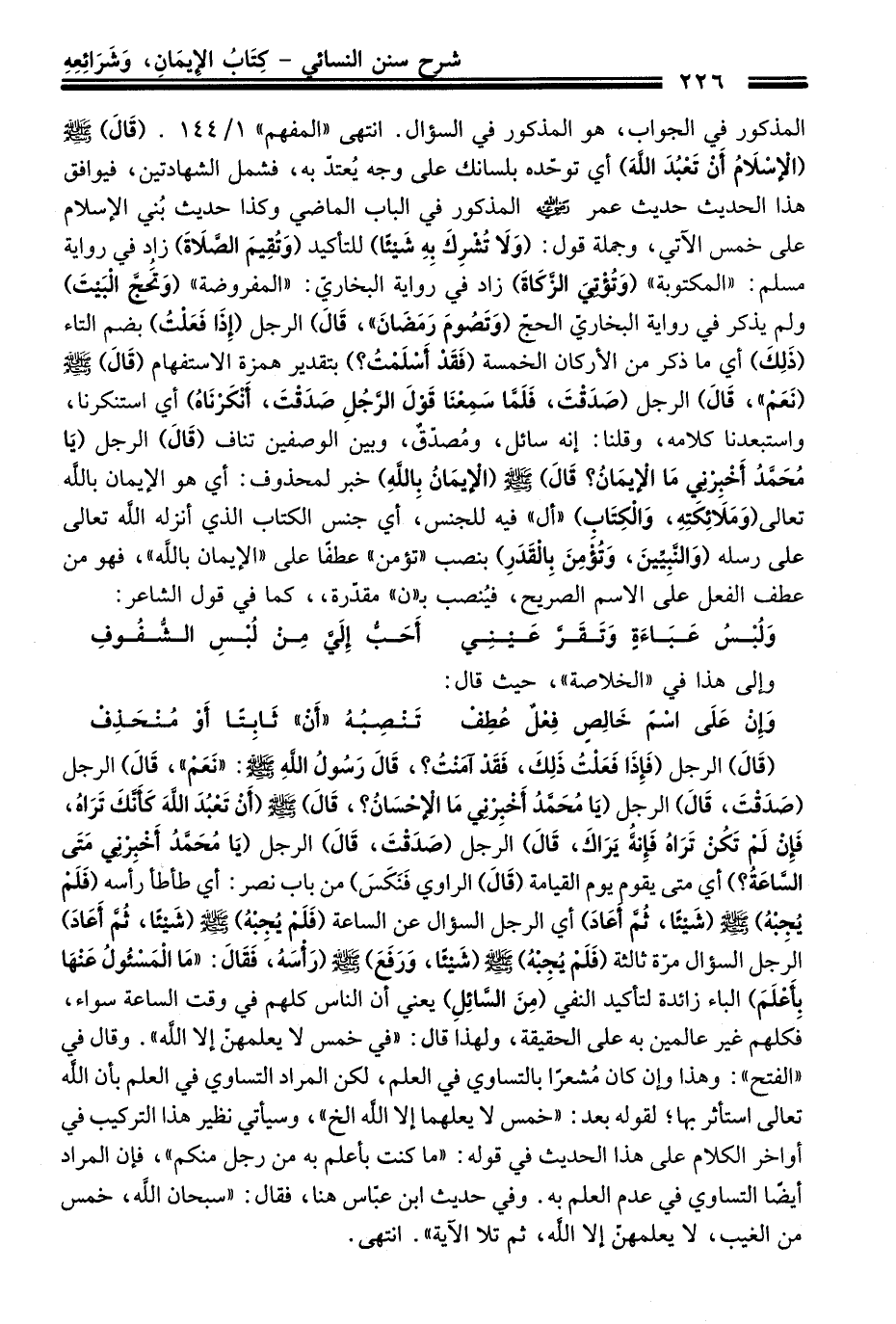 المذكور فِي الجواب، هو المذكور فِي السؤال. انتهى "المفهم" 1/ 144. (قَالَ) -صلى الله عليه وسلم- (الْإسْلَامُ أَنْ تَعْبُدَ اللهَ) أي توحده بلسانك عَلَى وجه يُعتدّ به، فشمل الشهادتين، فيوافق هَذَا الْحَدِيث حديث عمر -رضي الله عنه- المذكور فِي الباب الماضي وكذا حديث بُني الإسلام عَلَى خمس الآتي، وجملة قول: (وَلَا تُشْرِكَ بِهِ شَيْئًا) للتأكيد (وَتُقِيمَ الصَّلَاةَ) زاد فِي رواية مسلم: "المكتوبة" (وَتُؤْتيَ الزَّكَاةَ) زاد فِي رواية البخاريّ: "المفروضة" (وَتَحُجَّ الْبَيْتَ) ولم يذكر فِي رواية البخاريّ الحجّ (وَتَصُومَ رَمَضَانَ"، قَالَ) الرجل (إِذَا فَعَلتُ) بضم التاء (ذَلِكَ) أي ما ذكر منْ الأركان الخمسة (فَقَدْ أَسْلَمْتُ؟) بتقدير همزة الاستفهام (قَالَ) -صلى الله عليه وسلم- (نَعَمْ"، قَالَ) الرجل (صَدَقْتَ، فَلَمَّا سَمِعْنَا قَوْلَ الرَّجُلِ صَدَقْتَ، أَنْكَرْنَاهُ) أي استنكرنا، واستبعدنا كلامه، وقلنا: إنه سائل، ومُصدّقٌ، وبين الوصفين تناف (قَالَ) الرجل (يَا مُحَمَّدُ أَخْبِرْني مَا الْإيمَانُ؟ قَالَ) -صلى الله عليه وسلم- (الإِيمَانُ باللهِ) خبر لمحذوف: أي هو الإيمان بالله تعالى (وَمَلَائِكَتِهِ، وَالْكِتَابِ) "أل" فيه للجنس، أي جنس الكتاب الذي أنزله الله تعالى عَلَى رسله (وَالنَّبِيِّينَ، وَتُؤْمِنَ بِالْقَدَرِ) بنصب "تؤمن" عطفًا عَلَى "الإيمان بالله"، فهو منْ عطف الفعل علَى الاسم الصرَيح، فيُنصب بـ"ن" مقدّرة،، كما فِي قول الشاعر: