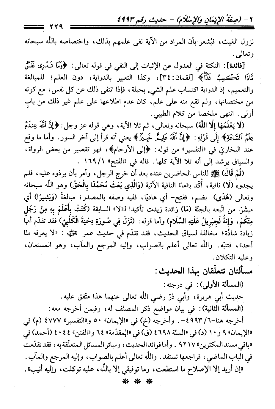 أخرجه هنا -6/ 4993 - . وأخرجه (خ) فِي "الإيمان" 50 و"التفسير" 4777 (م) فِي "الإيمان" 9 و10 (د) فِي "السنّة" 4698 (ق) فِي "المقدّمة" 64 و"الفتن" 4044 (أحمد) فِي "باقي مسند المكثرين" 9217. وأما فوائد الْحَدِيث، وسائر المسائل المتعلّقة به، فقد تقدّمت فِي الباب الماضي، فراجعها تستفد. والله تعالى أعلم بالصواب، وإليه المرجع والمآب.