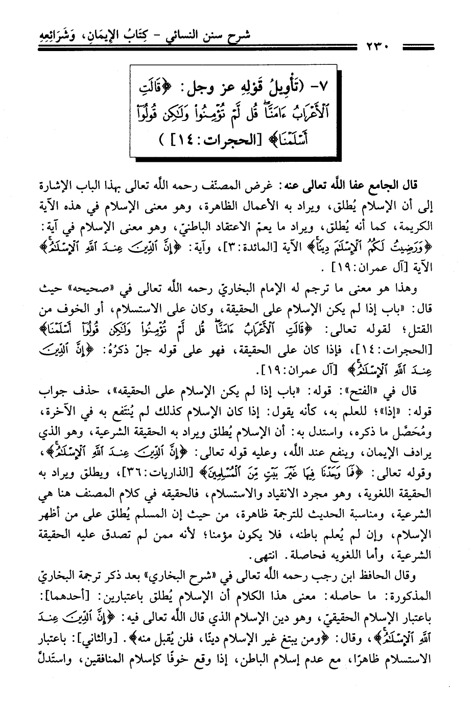 وَقَالَ الحافظ ابن رَجَب رحمه الله تعالى فِي "شرح البخاريّ" بعد ذكر ترجمة البخاريّ المذكورة: ما حاصله: معنى هَذَا الكلام أن الإسلام يُطلق باعتبارين: [أحدهما]: باعتبار الإسلام الحقيقيّ، وهو دين الإسلام الذي قَالَ الله تعالى فيه: {إِنَّ الدِّينَ عِنْدَ اللَّهِ الْإِسْلَامُ}، وَقَالَ: {وَمَنْ يَبْتَغِ غَيْرَ الْإِسْلَامِ دِينًا فَلَنْ يُقْبَلَ مِنْهُ}. [والثاني]: باعتبار الاستسلام ظاهرًا، مع عدم إسلام الباطن، إذا وقع خوفًا كإسلام المنافقين، واستَدلّ