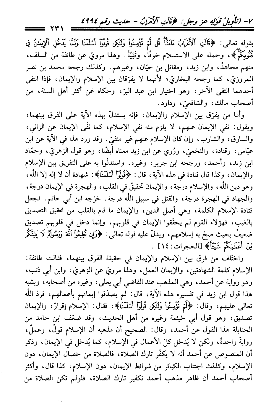 وأما منْ يفرّق بين الإسلام والإيمان، فإنه يستدلّ بهذه الآية عَلَى الفرق بينهما، ويقول: نفي الإيمان عنهم، لا يلزم منه نفي الإسلام، كما نفَى الإيمان عن الزاني، والسارق، والشارب، وإن كَانَ الإسلام عنهم غير منفيّ. وَقَدْ ورد هَذَا فِي الآية عن ابن عباس، وقتادة، والنخعيّ، ورُوي عن ابن زيد معناه أيضًا، وهو قول الزهريّ، وحمّاد ابن زيد، وأحمد، ورجحه ابن جرير، وغيره. واستدلّوا به عَلَى التفريق بين الإسلام والإيمان، وكذا قَالَ قتادة فِي هذه الآية، قَالَ: {قُولُوا أَسْلَمْنَا}: شهادة أن لا إله إلا الله، وهو دين الله، والإسلام درجة، والإيمان تحقيقٌ فِي القلب، والهجرة فِي الإيمان درجة، والجهاد فِي الهجرة درجة، والقتل فِي سبيل الله درجة. خرجه ابن أبي حاتم. فجعل قتادة الإسلام الكلمة، وهي أصل الدين، والإيمان ما قام بالقلب منْ تحقيق التصديق بالغيب، فهؤلاء القوم لم يحقّقوا الإيمان فِي قلوبهم، وإنما دخل فِي قلوبهم تصديق ضعيفٌ بحيث صحّ به إسلامهم، ويدلّ عليه قوله تعالى: {وَإِنْ تُطِيعُوا اللَّهَ وَرَسُولَهُ لَا يَلِتْكُمْ مِنْ أَعْمَالِكُمْ شَيْئًا} [الحجرات: 14].