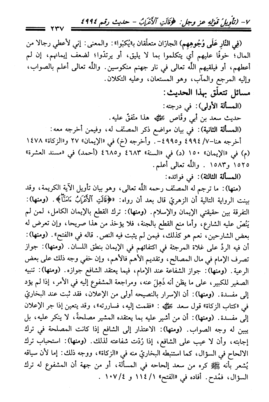 (منها): ما ترجم له المصنّف رحمه الله تعالى، وهو بيان تأويل الآية الكريمة، وَقَدْ بينت الرواية التالية أن الزهريّ قَالَ بعد أن رواه: {قَالَتِ الْأَعْرَابُ آمَنَّا}. (ومنها): التفرقة بين حقيقتي الإيمان والإسلام. (ومنها): ترك القطع بالإيمان الكامل، لمن لم يَنُصّ عليه الشارع، وأما منع القطع بالجنة، فلا يؤخذ منْ هَذَا صريحا، وإن تعرض له بعض الشارحين، نعم هو كذلك، فيمن لم يثبت فيه النص. قاله فِي "الفتح". (ومنها): أن فيه الردَّ عَلَى غلاة المرجئة فِي اكتفائهم فِي الإيمان بنطق اللسان. (ومنها): جواز تصرف الإمام فِي مال المصالح، وتقديم الأهم فالأهم، وإن خفي وجه ذلك عَلَى بعض الرعية. (ومنها): جواز الشفاعة عند الإمام، فيما يعتقد الشافع جوازه. (ومنها): تنبيه الصغير للكبير، عَلَى ما يظن أنه ذَهِلَ عنه، ومراجعة المشفوع إليه فِي الأمر، إذا لم يؤد إلى مفسدة. (ومنها): أن الإسرار بالنصيحه أولى منْ الإعلان، فقد ثبت عند البخاريّ فِي "كتاب الزكاة" قول سعد -رضي الله عنه-: "فقمت إليه، فساررته"، وَقَدْ يتعين إذا جر الإعلان إلى مفسدة. (ومنها): أن منْ أشير عليه بما يعتقده المشير مصلحةً، لا ينكر عليه، بل يبين له وجه الصواب. (ومنها): الاعتذار إلى الشافع إذا كانت المصلحة فِي ترك إجابته، وأن لا عيب عَلَى الشافع، إذا رُدّت شفاعته لذلك. (ومنها): استحباب ترك الالحاح فِي السؤال، كما استنبطه البخاريّ منه فِي "الزكاة"، ووجه ذلك: إما لأن سياقه يُشعر بأنه -صلى الله عليه وسلم- كره منْ سعد إلحاحه فِي المسألة، أو منْ جهة أن المشفوع له ترك السؤال، فمُدح. أفاده فِي "الفتح" 1/ 114 و4/ 107.