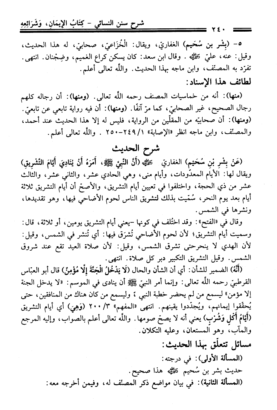 (عَنْ بِشْرِ بْنِ سُحَيْمٍ) الغفاريّ -رضي الله عنه- (أَنَّ النَّبِيَّ -صلى الله عليه وسلم-، أَمَرَهُ أَنْ يُنَادِيَ أَيَّامَ التَّشْرِيقِ) ويقال لها: الأيام المعدودات، وأيام منى، وهي الحادي عشر، والثاني عشر، والثالث عشر منْ ذي الحجة، واختلفوا فِي تعيين أيام التشريق، والأصحّ أن أيام التشريق ثلاثة أيام بعد يوم النحر، سُمّيت بذلك لتشريق النَّاس لحوم الأضاحي فيها، وهو تقديدها، ونشرها فِي الشمس.
