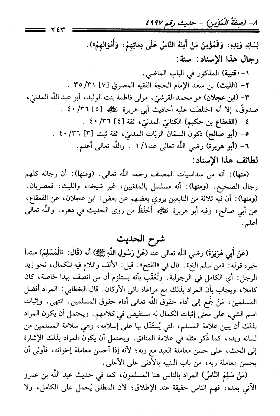 (عَنْ أَبِي هُرَيْرَةَ) رضي الله تعالى عنه (عَنْ رَسُولِ اللهِ -صلى الله عليه وسلم-) أنه (قَالَ: "الْمُسْلِمُ) مبتدأ خبره قوله: "منْ سلم الخ". قَالَ فِي "الفتح": قيل: الألف واللام فيه للكمال، نحو زيد الرجل: أي الكامل فِي الرجولية. وتُعُقّب بأنه يستلزم أن منْ اتصف بهذا خاصة، كَانَ كاملا، ويجاب بأن المراد بذلك مع مراعاة باقي الأركان. قَالَ الخطّابيّ: المراد أفضل المسلمين، مَنْ جَمَع إلى أداء حقوق الله تعالى أداء حقوق المسلمين. انتهى. وإثبات اسم الشيء عَلَى معنى إثبات الكمال له مستفيض فِي كلامهم. ويحتمل أن يكون المراد بذلك أن يبين علامة المسلم، التي يُستَدّل بها عَلَى إسلامه، وهي سلامة المسلمين منْ لسانه ويده، كما ذُكر مثله فِي علامة المنافق. ويحتمل أن يكون المراد بذلك الإشارة إلى الحث، عَلَى حسن معاملة العبد مع ربه؛ لأنه إذا أحسن معاملة إخوانه، فأولى أن يحسن معاملة ربه، منْ باب التنبيه بالأدنى عَلَى الأعلى.
