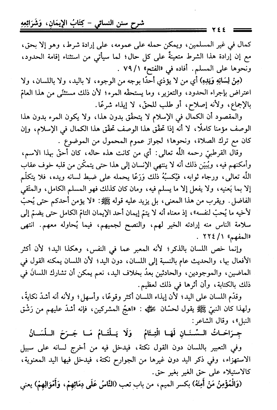 وَقَالَ القرطبيّ رحمه الله تعالى: أي منْ كانت هذه حاله، كَانَ أحقّ بهذا الاسم، وأمكنهم فيه، ويُبيّن ذلك أنه لا ينتهي الإنسان إلى هَذَا حَتَّى يتمكّن منْ قلبه خوف عقاب الله تعالى، ورجاء ثوابه، فيُكسبُهُ ذلك وَرَعًا يحمله عَلَى ضبط لسانه ويده، فلا يتكلّم إلا بما يَعنيه، ولا يفعل إلا ما يسلم فيه، ومن كَانَ كذلك فهو المسلم الكامل، والمتّقي الفاضل. ويقرب منْ هَذَا المعنى، بل يزيد عليه قوله -صلى الله عليه وسلم-: "لا يؤمن أحدكم حَتَّى يُحبّ لأخيه ما يُحبّ لنفسه"، إذ معناه أنه لا يتمّ إيمان أحد الإيمان التامّ الكامل حَتَّى يضمّ إلى سلامة النَّاس منه إرادته الخير لهم، والنصح لجميهم، فيما يُحاوله معهم. انتهى "المفهم" 1/ 224.