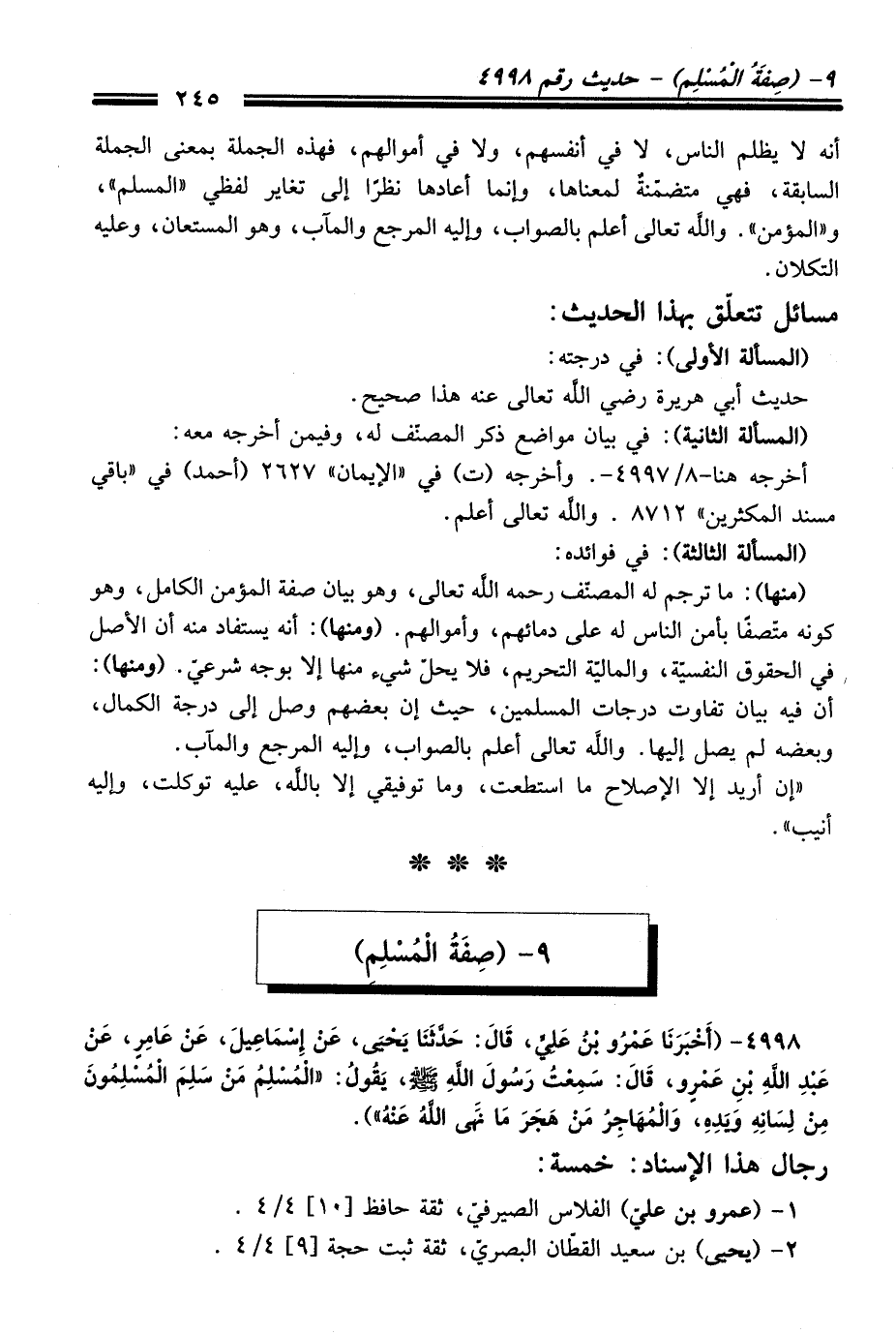 أنه لا يظلم النَّاس، لا فِي أنفسهم، ولا فِي أموالهم، فهذه الجملة بمعنى الجملة السابقة، فهي متضمّنةٌ لمعناها، وإنما أعادها نظرًا إلى تغاير لفظي "المسلم"، و"المؤمن". والله تعالى أعلم بالصواب، وإليه المرجع والمآب، وهو المستعان، وعليه التكلان.