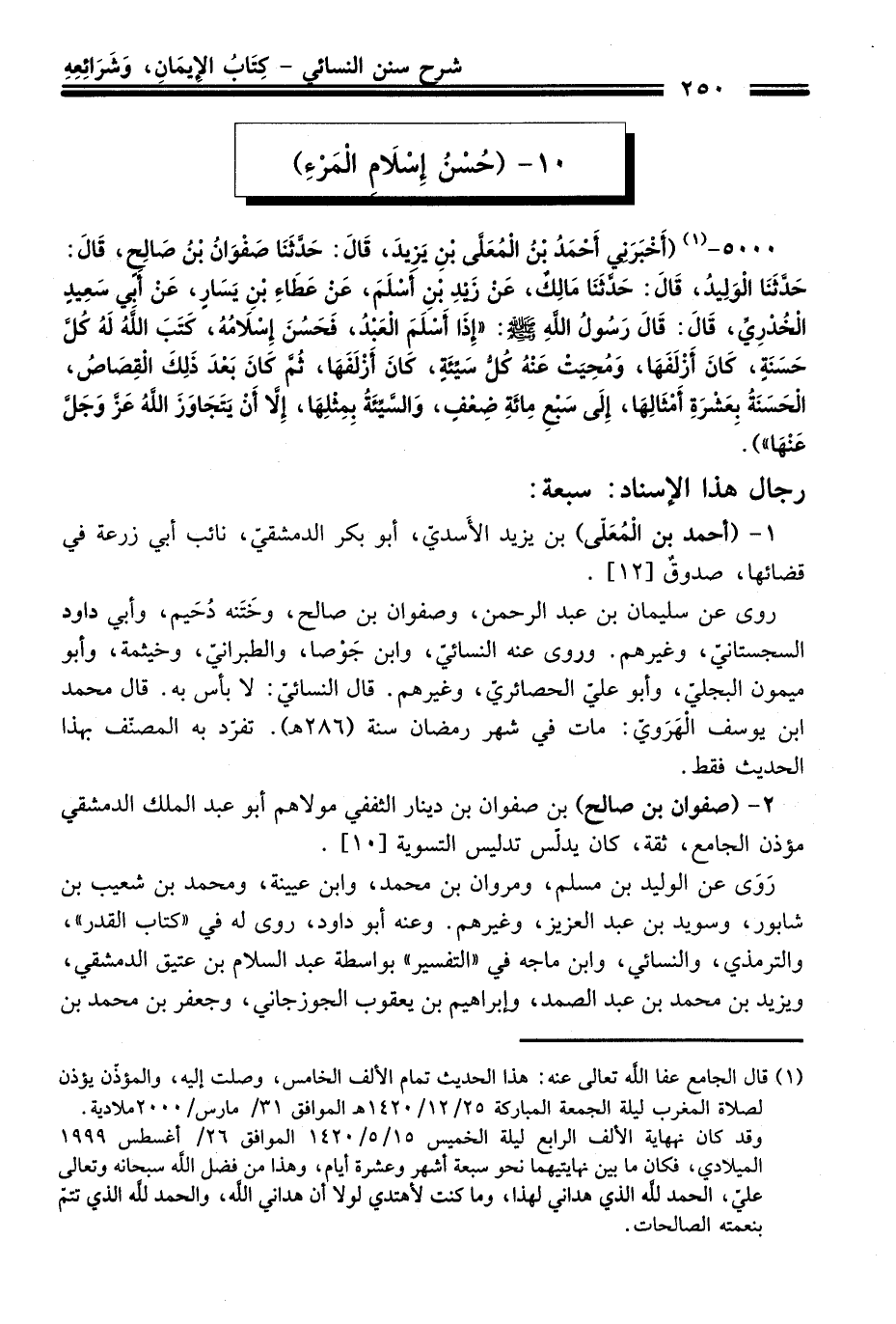 (¬1) قَالَ الجامع عفا الله تعالى عنه: هَذَا الْحَدِيث تمام الألف الخامس، وصلت إليه، والمؤذن يؤذن لصلاة المغرب ليلة الجمعة المباركة 25/ 12/ 1420 هـ الموافق 31/ مارس / 2000 ميلادية. وَقَدْ كَانَ نهاية الألف الرابع ليلة الخميس 15/ 5/ 1420 الموافق 26/ أغسطس 1999 الميلادي، فكان ما بين نهايتيهما نحو سبعة أشهر وعشرة أيام، وهذا منْ فضل الله سبحانه وتعالى عليّ، الحمد لله الذي هداني لهذا، وما كنت لأهتدي لولا أن هداني الله، والحمد لله الذي تتمّ بنعمته الصالحات.