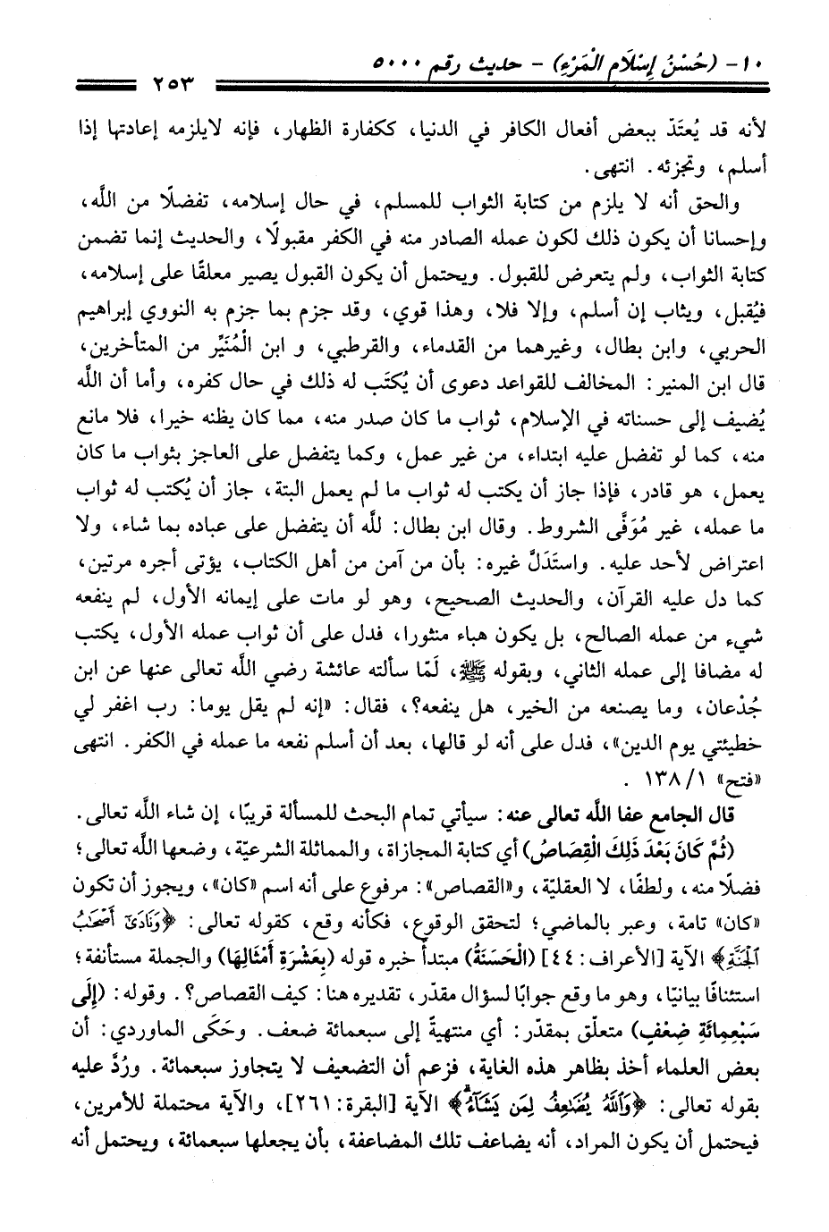والحق أنه لا يلزم منْ كتابة الثواب للمسلم، فِي حال إسلامه، تفضلاً منْ الله، وإحسانا أن يكون ذلك لكون عمله الصادر منه فِي الكفر مقبولاً، والحديث إنما تضمن كتابة الثواب، ولم يتعرض للقبول. ويحتمل أن يكون القبول يصير معلقًا عَلَى إسلامه، فيُقبل، ويثاب إن أسلم، وإلا فلا، وهذا قوي، وَقَدْ جزم بما جزم به النوويّ إبراهيم الحربي، وابن بطال، وغيرهما منْ القدماء، والقرطبي، وابن الْمُنَيِّر منْ المتأخرين، قَالَ ابن المنير: المخالف للقواعد دعوى أن يُكتَب له ذلك فِي حال كفره، وأما أن الله يُضيف إلى حسناته فِي الإسلام، ثواب ما كَانَ صدر منه، مما كَانَ يظنه خيرا، فلا مانع منه، كما لو تفضل عليه ابتداء، منْ غير عمل، وكما يتفضل عَلَى العاجز بثواب ما كَانَ يعمل، هو قادر، فإذا جاز أن يكتب له ثواب ما لم يعمل البتة، جاز أن يُكتب له ثواب ما عمله، غير مُوَفَّى الشروط. وَقَالَ ابن بطال: لله أن يتفضل عَلَى عباده بما شاء، ولا اعتراض لأحد عليه. واستَدَلَّ غيره: بأن منْ آمن منْ أهل الكتاب، يؤتى أجره مرتين، كما دل عليه القرآن، والحديث الصحيح، وهو لو مات عَلَى إيمانه الأول، لم ينفعه شيء منْ عمله الصالح، بل يكون هباء منثورا، فدل عَلَى أن ثواب عمله الأول، يكتب له مضافا إلى عمله الثاني، وبقوله -صلى الله عليه وسلم-، لَمّا سألته عائشة رضي الله تعالى عنها عن ابن جُدْعان، وما يصنعه منْ الخير، هل ينفعه؟، فَقَالَ: "إنه لم يقل يوما: رب اغفر لي خطيئتي يوم الدين"، فدل عَلَى أنه لو قالها، بعد أن أسلم نفعه ما عمله فِي الكفر. انتهى "فتح" 1/ 138.