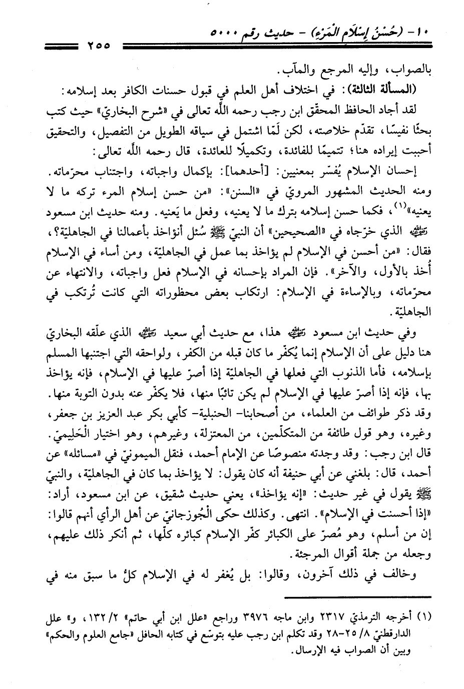 (المسألة الثالثة): فِي اختلاف أهل العلم فِي قبول حسنات الكافر بعد إسلامه: لقد أجاد الحافظ المحقّق ابن رَجَب رحمه الله تعالى فِي "شرح البخاريّ" حيث كتب بحثًا نفيسًا، تقدّم خلاصته، لكن لَمّا اشتمل فِي سياقه الطويل منْ التفصيل، والتحقيق أحببت إيراده هنا؛ تتميمًا للفائدة، وتكميلاً للعائدة، قَالَ رحمه الله تعالى: