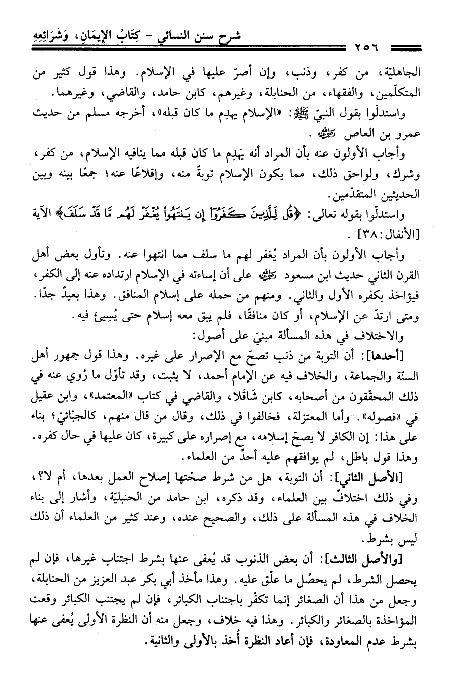 [أحدها]: أن التوبة منْ ذنب تصحّ مع الإصرار عَلَى غيره. وهذا قول جمهور أهل السنّة والجماعة، والخلاف فيه عن الإمام أحمد، لا يثبت، وَقَدْ تأوّل ما رُوي عنه فِي ذلك المحقّقون منْ أصحابه، كابن شَاقَلا، والقاضي فِي كتاب "المعتمد"، وابن عقيل فِي "فصوله". وأما المعتزلة، فخالفوا فِي ذلك، وَقَالَ منْ قَالَ منهم، كالجبّائيّ؛ بناء عَلَى هَذَا: إن الكافر لا يصح إسلامه، مع إصراره عَلَى كبيرة، كَانَ عليها فِي حال كفره. وهذا قول باطل، لم يوافقهم عليه أحدٌ منْ العلماء
