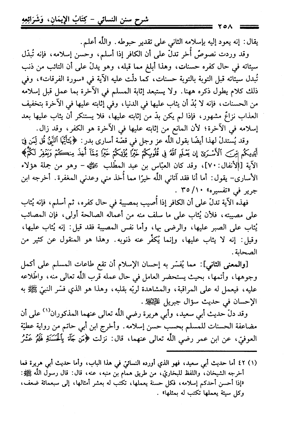 (¬1) 42 أما حديث أبي سعيد، فهو الذي أورده النسائيّ فِي هَذَا الباب، وأما حديث أبي هريرة فما أخرجه الشيخان، واللفظ للبخاريّ، منْ طريق همام بن منبه، عنه، قَالَ: قَالَ رسول الله -صلى الله عليه وسلم-: "إذا أحسن أحدكم إسلامه، فكل حسنة يعملها، تكتب له بعشر أمثالها، إلى سبعمائة ضعف، وكل سيئة يعملها تكتب له بمثلها".