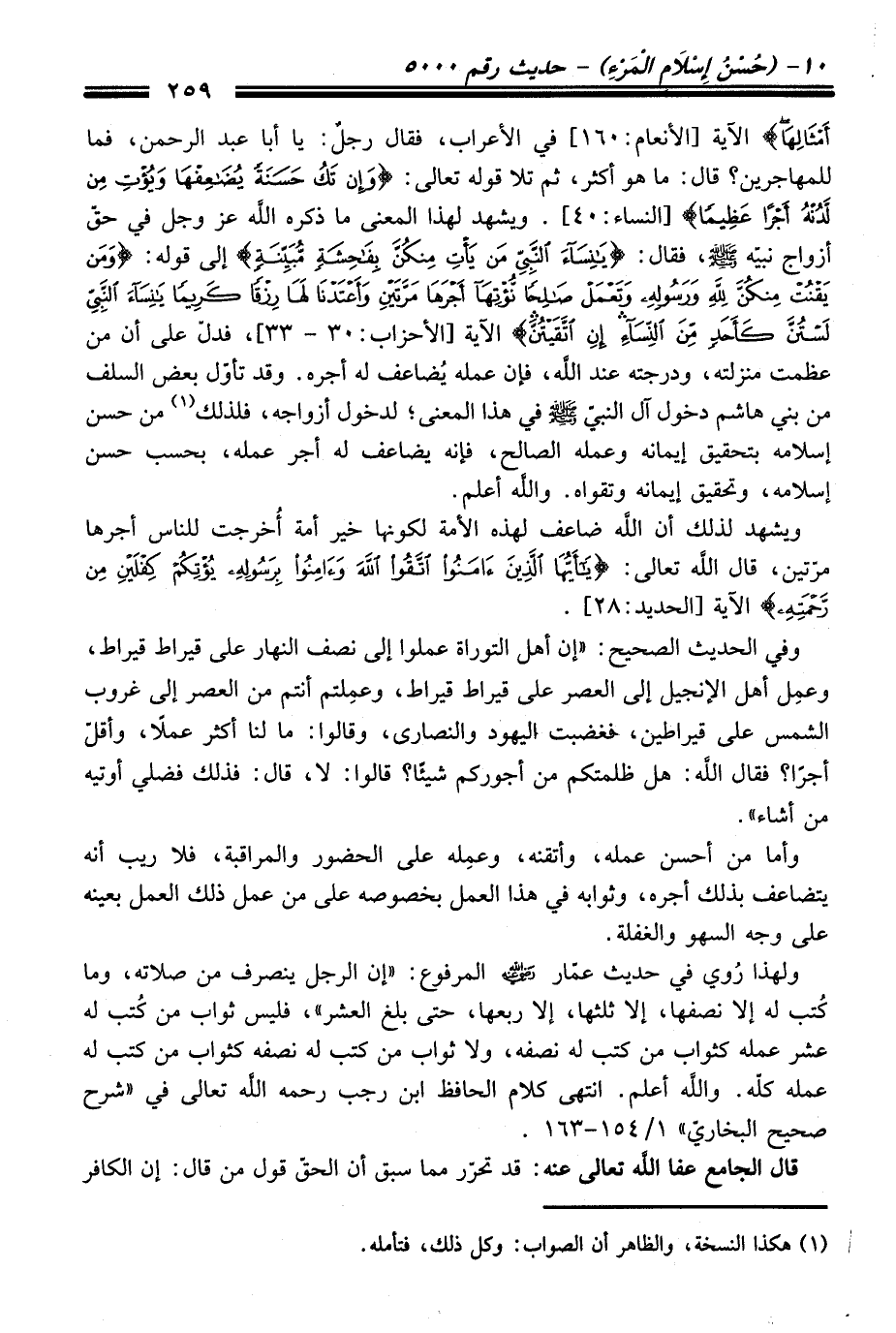 أَمْثَالِهَا} الآية [الأنعام: 160] فِي الأعراب، فَقَالَ رجلٌ: يا أبا عبد الرحمن، فما للمهاجرين؟ قَالَ: ما هو أكثر، ثم تلا قوله تعالى: {وَإِنْ تَكُ حَسَنَةً يُضَاعِفْهَا وَيُؤْتِ مِنْ لَدُنْهُ أَجْرًا عَظِيمًا} [النِّساء: 40]. ويشهد لهذا المعنى ما ذكره الله عز وجل فِي حقّ أزواج نبيّه -صلى الله عليه وسلم-، فَقَالَ: {يَا نِسَاءَ النَّبِيِّ مَنْ يَأْتِ مِنْكُنَّ بِفَاحِشَةٍ مُبَيِّنَةٍ} إلى قوله: {وَمَنْ يَقْنُتْ مِنْكُنَّ لِلَّهِ وَرَسُولِهِ وَتَعْمَلْ صَالِحًا نُؤْتِهَا أَجْرَهَا مَرَّتَيْنِ وَأَعْتَدْنَا لَهَا رِزْقًا كَرِيمًا يَا نِسَاءَ النَّبِيِّ لَسْتُنَّ كَأَحَدٍ مِنَ النِّسَاءِ إِنِ اتَّقَيْتُنَّ} الآية [الأحزاب: 30 - 32]، فدلّ عَلَى أن منْ عظمت منزلته، ودرجته عند الله، فإن عمله يُضاعف له أجره. وَقَدْ تأول بعض السلف منْ بني هاشم دخول آل النبيّ -صلى الله عليه وسلم- فِي هَذَا المعنى؛ لدخول أزواجه، فلذلك (¬1) منْ حسن إسلامه بتحقيق إيمانه وعمله الصالح، فإنه يضاعف له أجر عمله، بحسب حسن إسلامه، وتحقيق إيمانه وتقواه. والله أعلم.