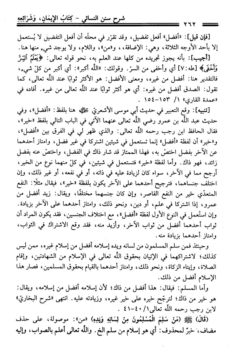 وحينئذ فمن سلم المسلمون منْ لسانه ويده إسلامه أفضل منْ إسلام غيره، ممن ليس كذلك؛ لاشتراكهما فِي الإتيان بحقوق الله تعالى فِي الإسلام منْ الشهادتين، وإقام الصلاة، وإيتاء الزكاة، ونحو ذلك، وامتاز أحدهما بالقيام بحقوق المسلمين، فصار هَذَا الإسلام أفضل منْ ذلك.