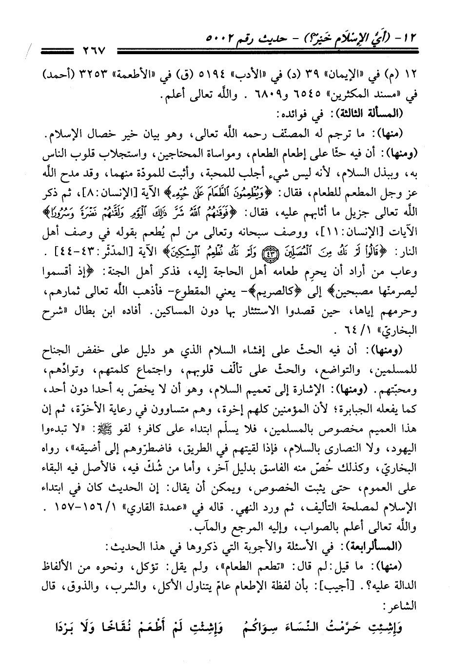 (ومنها): أن فيه حثًّا عَلَى إطعام الطعام، ومواساة المحتاجين، واستجلاب قلوب النَّاس به، وببذل السلام، لأنه ليس شيء أجلب للمحبة، وأثبت للمودّة منهما، وَقَدْ مدح الله عز وجل المطعم للطعام، فَقَالَ: {وَيُطْعِمُونَ الطَّعَامَ عَلَى حُبِّهِ} الآية [الإنسان: 8]، ثم ذكر الله تعالى جزيل ما أثابهم عليه، فَقَالَ: {فَوَقَاهُمُ اللَّهُ شَرَّ ذَلِكَ الْيَوْمِ وَلَقَّاهُمْ نَضْرَةً وَسُرُورًا} الآيات [الإنسان: 11]، ووصف سبحانه وتعالى منْ لم يُطعم بقوله فِي وصف أهل النار: {قَالُوا لَمْ نَكُ مِنَ الْمُصَلِّينَ (43) وَلَمْ نَكُ نُطْعِمُ الْمِسْكِينَ} الآية [المدثر: 43 - 44]. وعاب منْ أراد أن يحرِم طعامه أهل الحاجة إليه، فذكر أهل الجنة: {إِذْ أَقْسَمُوا لَيَصْرِمُنَّهَا مُصْبِحِينَ} إلى {كَالصَّرِيمِ} -يعني المقطوع- فأذهب الله تعالى ثمارهم، وحرمهم إياها، حين قصدوا الاستئثار بها دون المساكين. أفاده ابن بطال "شرح البخاريّ" 1/ 64.