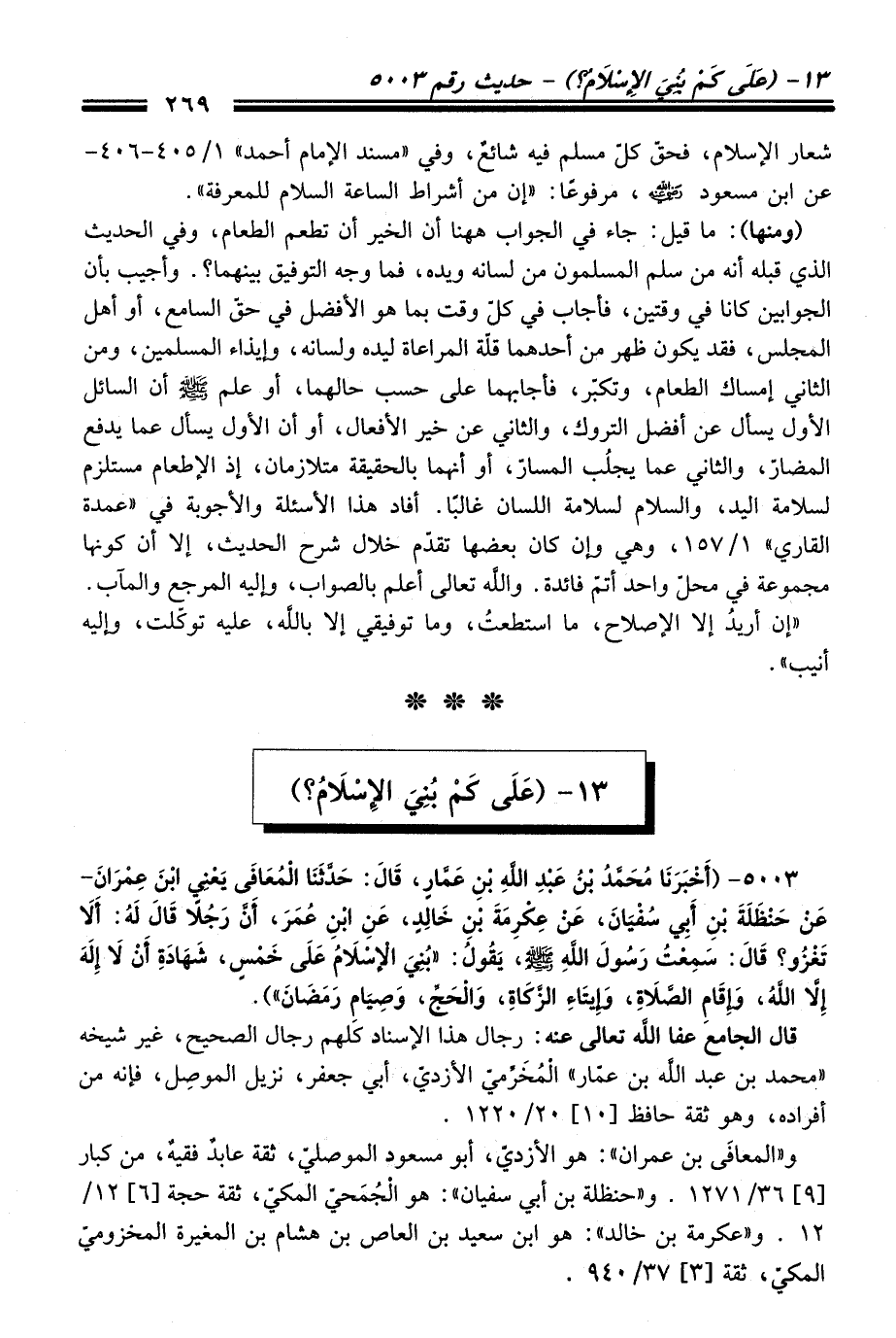 5003 - (أَخْبَرَنَا مُحَمَّدُ بْنُ عَبْدِ اللَّهِ بْنِ عَمَّارٍ، قَالَ: حَدَّثَنَا الْمُعَافَى يَعْنِي ابْنَ عِمْرَانَ- عَنْ حَنْظَلَةَ بْنِ أَبِي سُفْيَانَ، عَنْ عِكْرِمَةَ بْنِ خَالِدٍ، عَنِ ابْنِ عُمَرَ، أَنَّ رَجُلاً قَالَ لَهُ: أَلاَ تَغْزُو؟ قَالَ: سَمِعْتُ رَسُولَ اللَّهِ -صلى الله عليه وسلم-، يَقُولُ: "بُنِيَ الإِسْلاَمُ عَلَى خَمْسٍ، شَهَادَةِ أَنْ لاَ إِلَهَ إِلاَّ اللَّهُ، وَإِقَامِ الصَّلاَةِ، وَإِيتَاءِ الزَّكَاةِ، وَالْحَجِّ، وَصِيَامِ رَمَضَانَ").