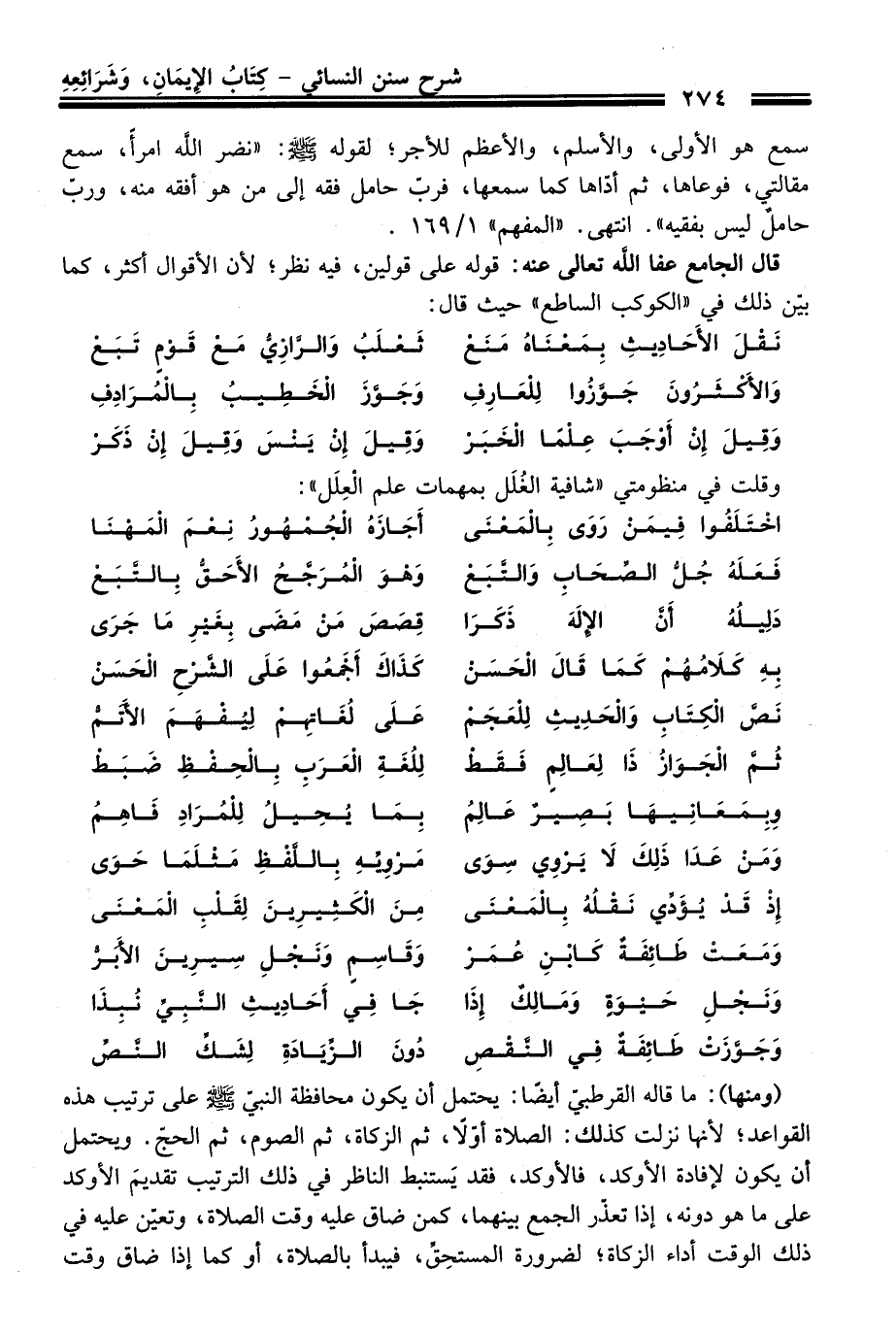 (ومنها): ما قاله القرطبيّ أيضًا: يحتمل أن يكون محافظة النبيّ -صلى الله عليه وسلم- عَلَى ترتيب هذه القواعد؛ لأنها نزلت كذلك: الصلاة أوّلاً، ثم الزكاة، ثم الصوم، ثم الحجّ. ويحتمل أن يكون لإفادة الأوكد، فالأوكد، فقد يَستنبط الناظر فِي ذلك الترتيب تقديمَ الأوكد عَلَى ما هو دونه، إذا تعذّر الجمع بينهما، كمن ضاق عليه وقت الصلاة، وتعيّن عليه فِي ذلك الوقت أداء الزكاة؛ لضرورة المستحِقِّ، فيبدأ بالصلاة، أو كما إذا ضاق وقت