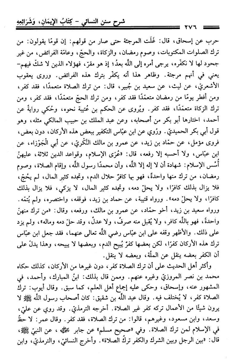 وأكثر أهل الْحَدِيث عَلَى أن ترك الصلاة كفر، دون غيرها منْ الأركان، كذلك حكاه محمد بن نصر المروزيّ وغيره عنهم. وممن قَالَ بذلك: ابنُ المبارك، وأحمد، فِي المشهور عنه، وإسحاق، وحكى عليه إجماع أهل العلم، كما سبق. وَقَالَ أيوب: ترك الصلاة كفر، لا يُختلف فيه. وَقَالَ عبد الله بن شقيق: كَانَ أصحاب رسول الله -صلى الله عليه وسلم- لا يرون شيئًا منْ الأعمال تركه كفر غير الصلاة. أخرجه الترمذيّ. وَقَدْ روي عن عليّ، وسعد، وابن مسعود، وغيرهم، قالوا: منْ ترك الصلاة، فقد كفر. وَقَالَ عمر: لا حظّ فِي الإسلام لمن ترك الصلاة. وفي "صحيح مسلم" عن جابر -رضي الله عنه-، عن النبيّ -صلى الله عليه وسلم-، قَالَ: "بين الرجل وبين الشرك والكفر تركُ الصلاة". وأخرج النسائيّ، والترمذيّ، وابن