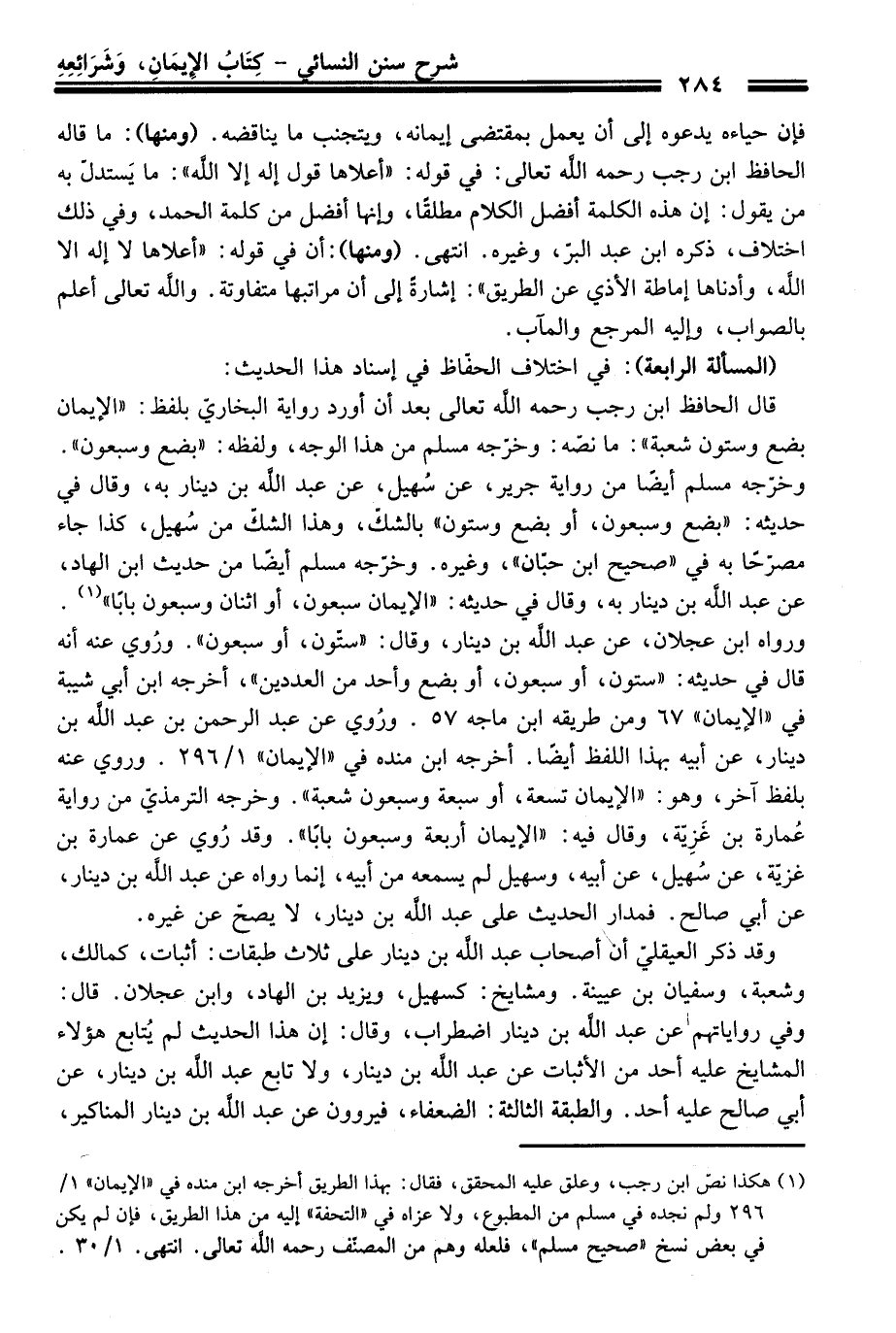(¬1) هكذا نصّ ابن رَجَب، وعلق عليه المحقق، فَقَالَ: بهذا الطريق أخرجه ابن منده فِي "الإيمان" 1/ 296 ولم نجده فِي مسلم منْ المطبوع، ولا عزاه فِي "التحفة" إليه منْ هَذَا الطريق، فإن لم يكن فِي بعض نسخ "صحيح مسلم"، فلعله وهم منْ المصنّف رحمه الله تعالى. انتهى. 1/ 30.