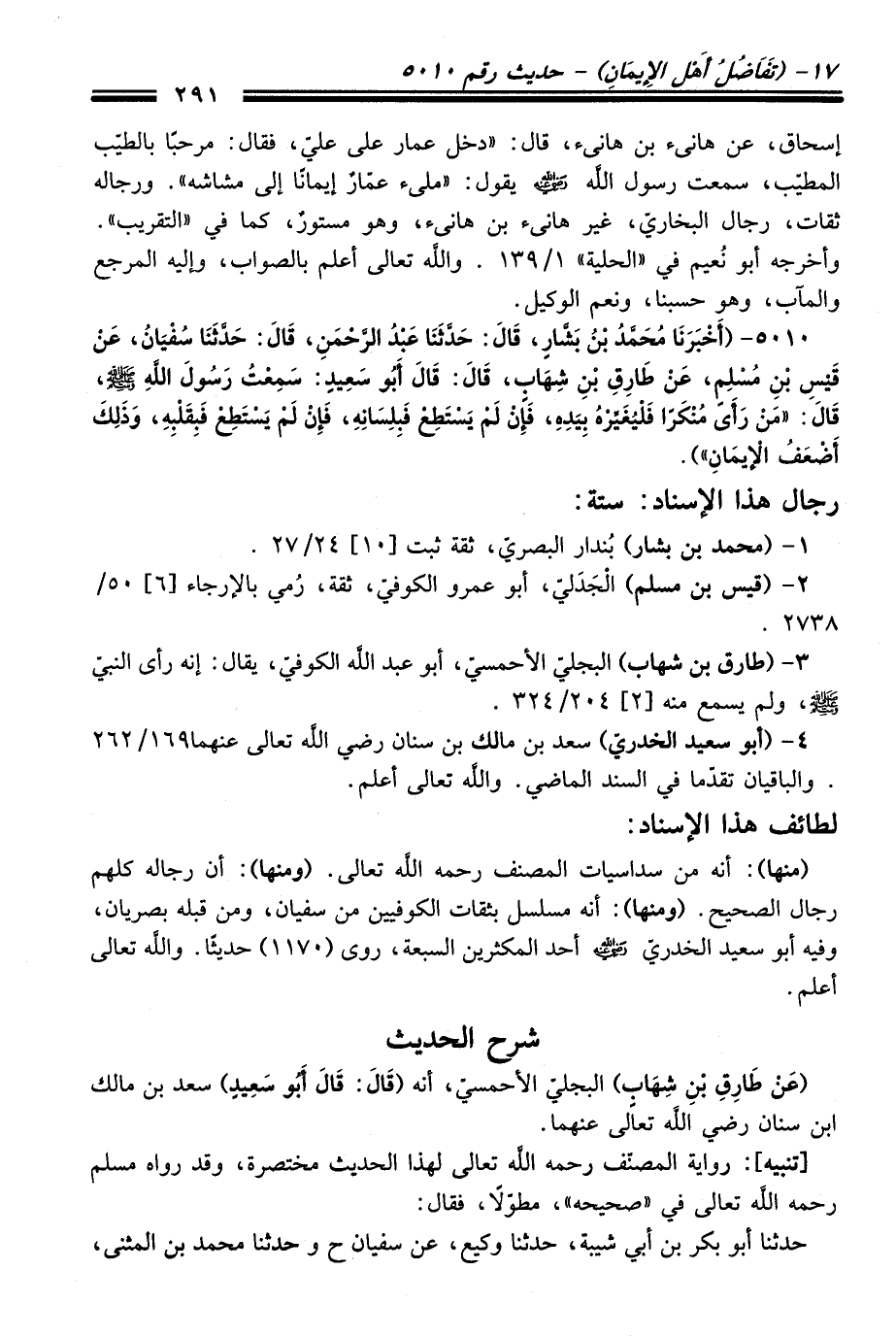 5010 - (أَخْبَرَنَا مُحَمَّدُ بْنُ بَشَّارٍ، قَالَ: حَدَّثَنَا عَبْدُ الرَّحْمَنِ، قَالَ: حَدَّثَنَا سُفْيَانُ، عَنْ قَيْسِ بْنِ مُسْلِمٍ، عَنْ طَارِقِ بْنِ شِهَابٍ، قَالَ: قَالَ أَبُو سَعِيدٍ: سَمِعْتُ رَسُولَ اللَّهِ -صلى الله عليه وسلم-، قَالَ: "مَنْ رَأَى مُنْكَرًا فَلْيُغَيِّرْهُ بِيَدِهِ، فَإِنْ لَمْ يَسْتَطِعْ فَبِلِسَانِهِ، فَإِنْ لَمْ يَسْتَطِعْ فَبِقَلْبِهِ، وَذَلِكَ أَضْعَفُ الإِيمَانِ").