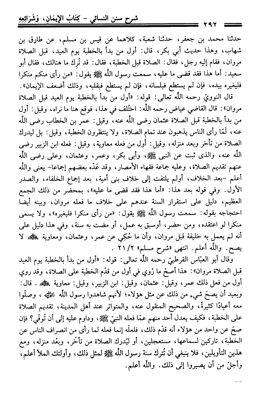 قَالَ النوويّ رحمه الله تعالى: قوله: "أول منْ بدأ بالخطبة يوم العيد قبل الصلاة مروان": قَالَ القاضي عياض رحمه الله: اختُلف فِي هَذَا، فوقع هنا ما نراه، وقيل: أول منْ بدأ بالخطبة قبل الصلاة عثمان رضى الله عنه، وقيل: عمر بن الخطاب رضى الله عنه، لَمّا رأى النَّاس يذهبون عند تمام الصلاة، ولا ينتظرون الخطبة، وقيل: بل ليدرك الصلاة منْ تأخر وبعد منزله، وقيل: أول منْ فعله معاوية، وقيل: فعله ابن الزبير رضى الله عنه، والذى ثبت عن النبى -صلى الله عليه وسلم-، وأبى بكر، وعمر، وعثمان، وعلي رضى الله عنهم تقديم الصلاة، وعليه جماعة فقهاء الأمصار، وَقَدْ عَدّه بعضهم إجماعا -يعنى والله أعلم- بعد الخلاف، أولم يلتفت إلى خلاف بنى أمية، بعد إجماع الخلفاء، والصدر الأول. وفي قوله بعد هَذَا: "أما هَذَا فقد قضى ما عليه"، بمحضر منْ ذلك الجمع العظيم، دليل عَلَى استقرار السنة عندهم عَلَى خلاف ما فعله مروان، وبينه أيضًا احتجاجه بقوله: سمعت رسول الله -صلى الله عليه وسلم- يقول: "منْ رأى منكرا فليغيره"، ولا يسمى منكرا لو اعتقده، ومن حضر، أو سبق به عمل، أو مضت به سنة، وفي هَذَا دليل عَلَى أنه لم يعمل به خليفة قبل مروان، وأن ما حُكِي عن عمر، وعثمان، ومعاوية -رضي الله عنهم- لا يصح. والله أعلم. انتهى "شرح مسلم" 2/ 21.