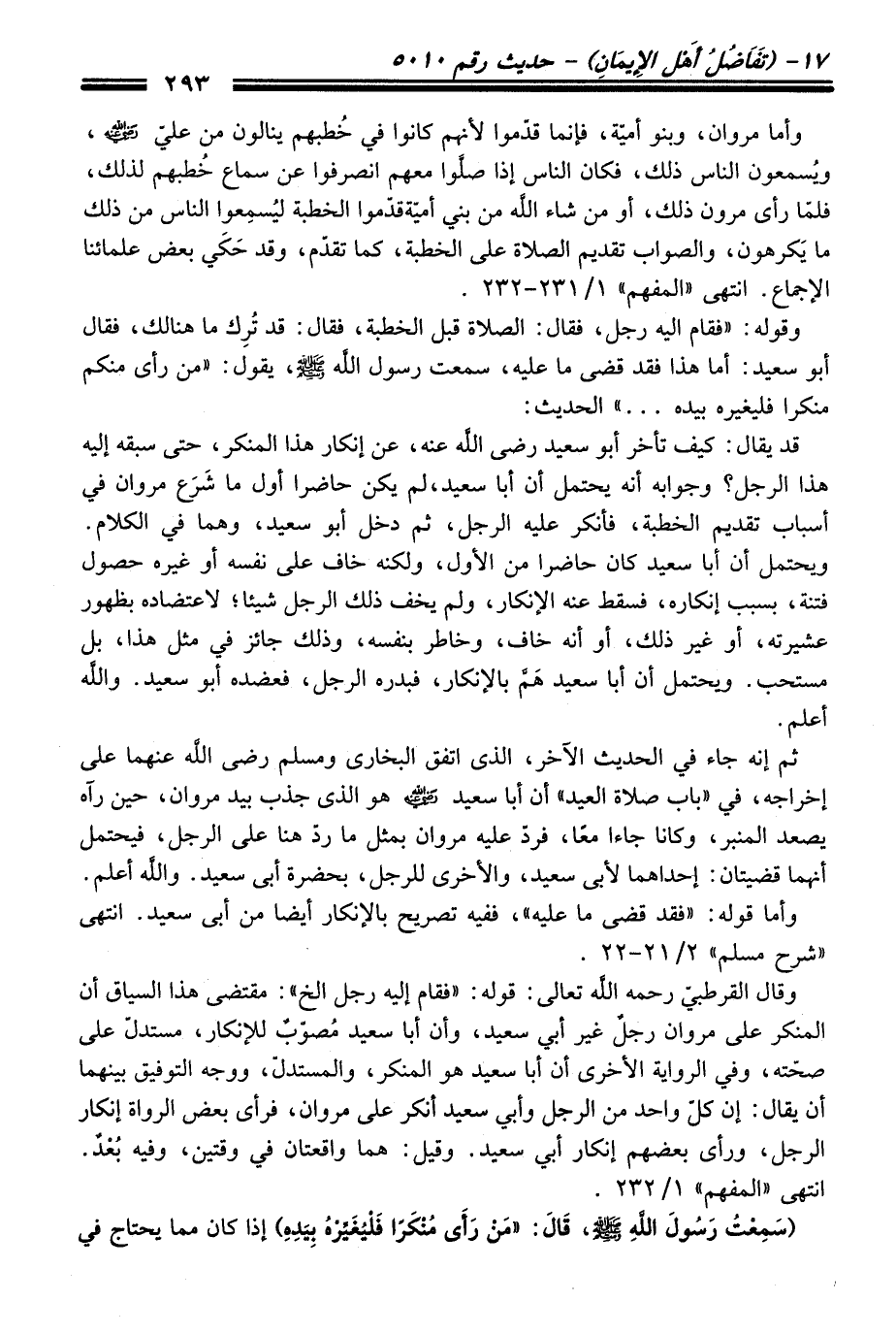 وَقَالَ القرطبيّ رحمه الله تعالى: قوله: "فقام إليه رجل الخ": مقتضى هَذَا السياق أن المنكر عَلَى مروان رجلٌ غير أبي سعيد، وأن أبا سعيد مُصوّبٌ للإنكار، مستدلّ عَلَى صحّته، وفي الرواية الأخرى أن أبا سعيد هو المنكر، والمستدلّ، ووجه التوفيق بينهما أن يقال: إن كلّ واحد منْ الرجل وأبي سعيد أنكر عَلَى مروان، فرأى بعض الرواة إنكار الرجل، ورأى بعضهم إنكار أبي سعيد. وقيل: هما واقعتان فِي وقتين، وفيه بُعْدٌ. انتهى "المفهم" 1/ 232.