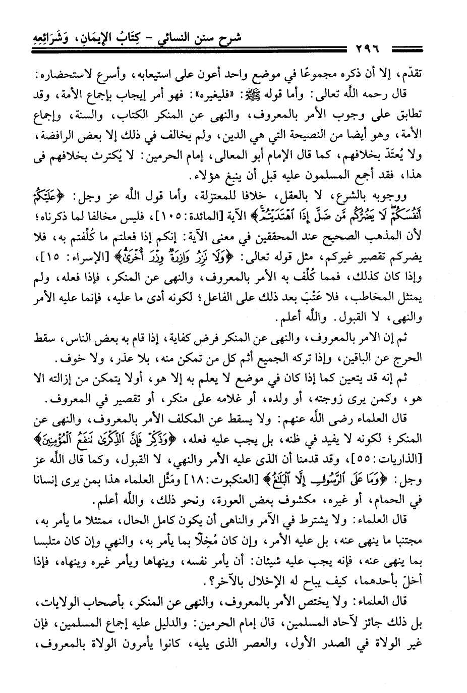 قَالَ العلماء رضى الله عنهم: ولا يسقط عن المكلف الأمر بالمعروف، والنهى عن المنكر؛ لكونه لا يفيد فِي ظنه، بل يجب عليه فعله، {وَذَكِّرْ فَإِنَّ الذِّكْرَى تَنْفَعُ الْمُؤْمِنِينَ} [الذاريات: 55]، وَقَدْ قدمنا أن الذى عليه الأمر والنهي، لا القبول، وكما قَالَ الله عز وجل: {وَمَا عَلَى الرَّسُولِ إِلَّا الْبَلَاغُ} [العنكبوت: 18] ومَثَّل العلماء هَذَا بمن يرى إنسانا فِي الحمام، أو غيره، مكشوف بعض العورة، ونحو ذلك، والله أعلم.