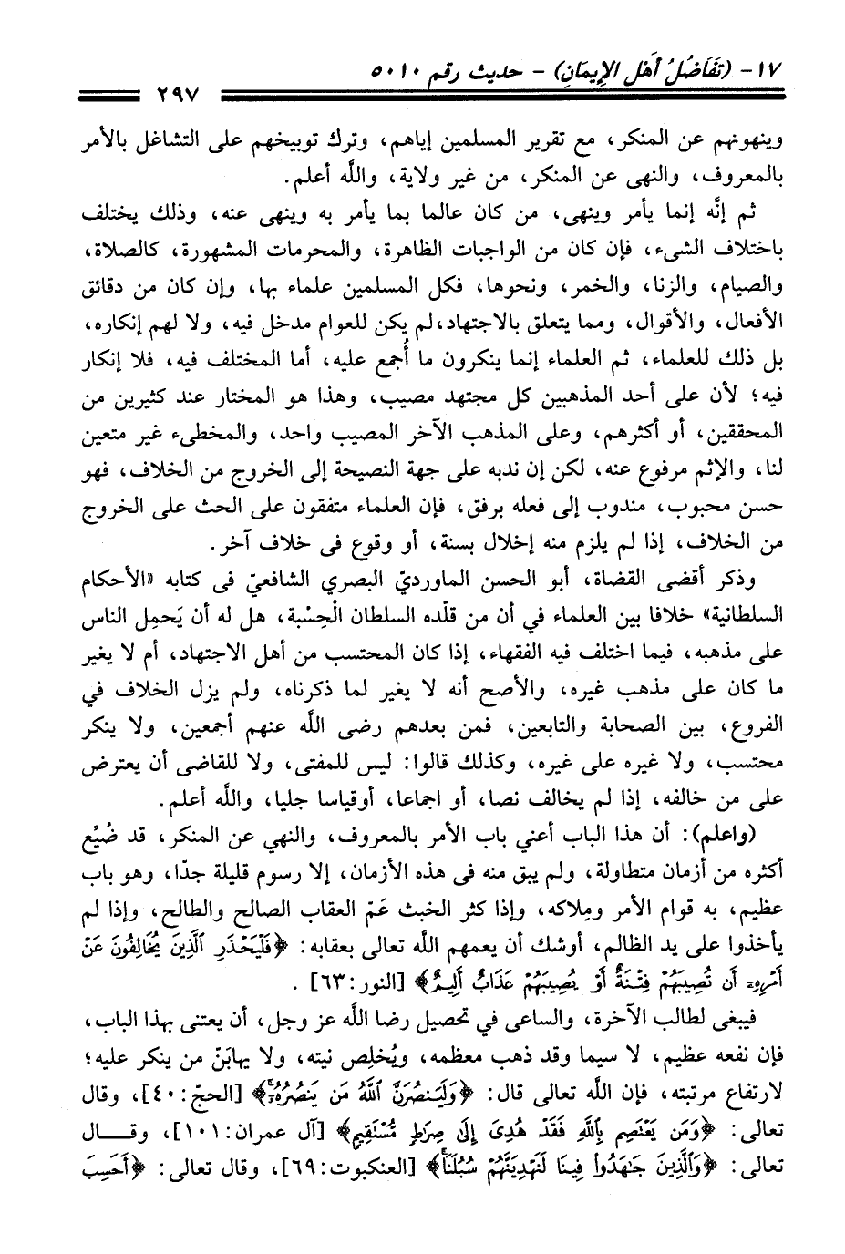 وذكر أقضى القضاة، أبو الحسن الماورديّ البصريّ الشافعيّ فى كتابه "الأحكام السلطانية" خلافا بين العلماء فِي أن منْ قلّده السلطان الْحِسبْة، هل له أن يَحمِل النَّاس عَلَى مذهبه، فيما اختلف فيه الفقهاء، إذا كَانَ المحتسب منْ أهل الاجتهاد، أم لا يغير ما كَانَ عَلَى مذهب غيره، والأصح أنه لا يغير لما ذكرناه، ولم يزل الخلاف فِي الفروع، بين الصحابة والتابعين، فمن بعدهم رضى الله عنهم أجمعين، ولا ينكر محتسب، ولا غيره عَلَى غيره، وكذلك قالوا: ليس للمفتى، ولا للقاضى أن يعترض عَلَى منْ خالفه، إذا لم يخالف نصا، أو اجماعا، أو قياسا جليا، والله أعلم.