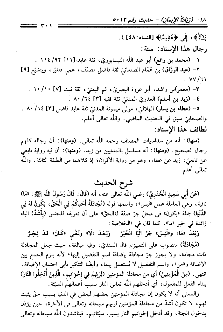 (عَنْ أَبِي سَعِيدٍ الْخُدْرِيِّ) رضي الله تعالى عنه، أنه (قَالَ: قَالَ رَسُولُ اللهِ -صلى الله عليه وسلم-: "مَا) نافية، وهي العاملة عمل "ليس"، واسمها قوله (مُجَادَلَةُ أَحَدِكُمْ فِي الْحَقِّ يَكُونُ لَهُ فِى الدُّنْيَا) جملة "يكون" فِي محلّ جرّ صفة لـ"الحقّ" عَلَى أن تعريفه للجنس (بِأَشَدَّ) الباء زائدة فِي خبر "ما"، كما قَالَ فِي "الخلاصة":