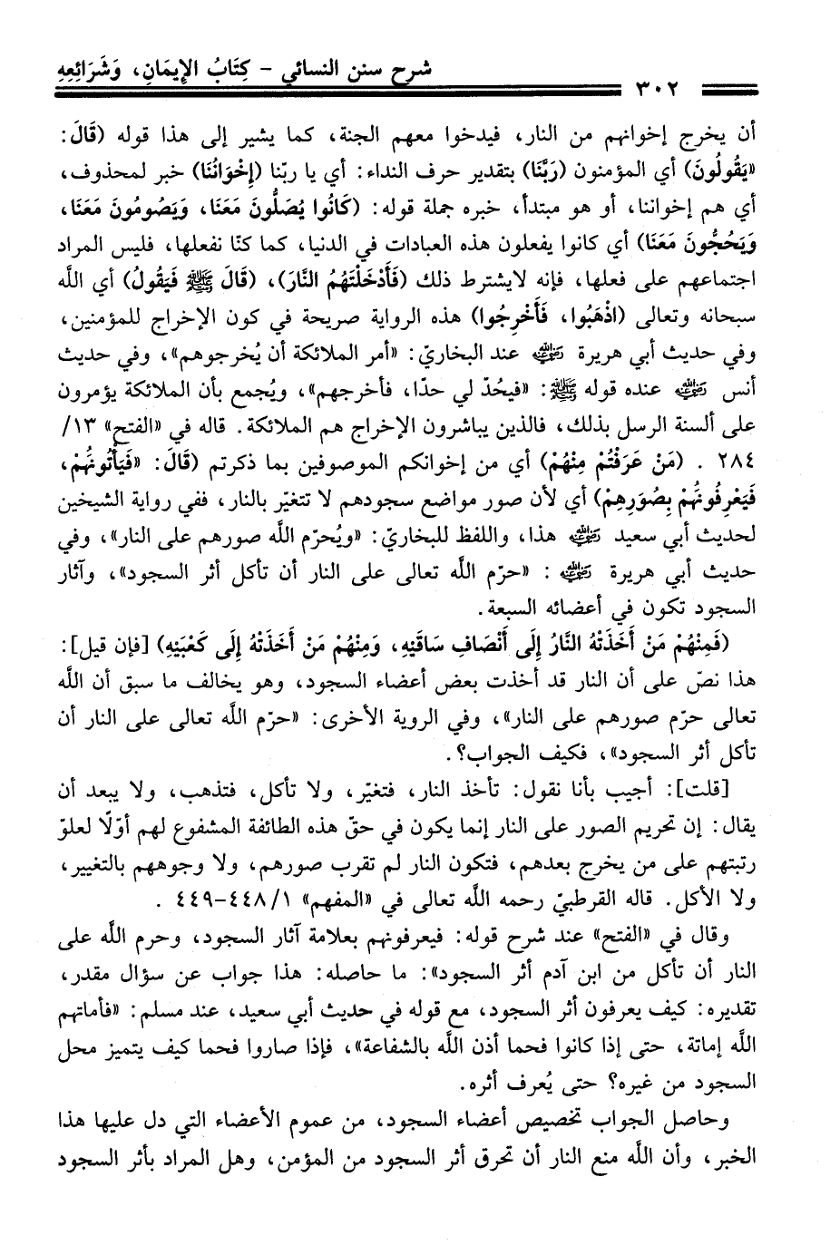 [قلت]: أجيب بأنا نقول: تأخذ النار، فتغيّر، ولا تأكل، فتذهب، ولا يبعد أن يقال: إن تحريم الصور عَلَى النار إنما يكون فِي حقّ هذه الطائفة المشفوع لهم أوّلاً لعلوّ رتبتهم عَلَى منْ يخرج بعدهم، فتكون النار لم تقرب صورهم، ولا وجوههم بالتغيير، ولا الأكل. قاله القرطبيّ رحمه الله تعالى فِي "المفهم" 1/ 448 - 449.