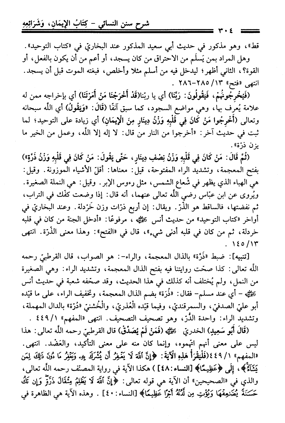 (ثُمَّ قَالَ: مَنْ كَانَ فِي قَلْبِهِ وَزْنُ نِصْفِ دِينَارٍ، حَتَّى يَقُولَ مَنْ كَانَ فِي قَلْبِهِ وَزْنُ ذَرَّةٍ") بفتح المعجمة، وتشديد الراء المفتوحة، قيل: معناها: أقلّ الأشياء الموزونة. وقيل: هي الهباء الذي يظهر فِي شُعاع الشمس، مثل رءوس الإبر. وقيل: هي النملة الصغيرة. وُيروى عن ابن عبّاس رضي الله تعالى عنهما، أنه قَالَ: إذا وضعت كفّك فِي التراب، ثم نفضتها، فالساقط هو الذّرّ. ويقال: إن أربع ذرّات وزن خَرْدلة. وعند البخاريّ فِي أواخر "كتاب التوحيد" منْ حديث أنس -رضي الله عنه-، مرفوعًا: "أدخل الجنة منْ كَانَ فِي قلبه خردلة، ثم منْ كَانَ فِي قلبه أدنى شيء"، قَالَ فِي "الفتح": وهذا معنى الذّرّة. انتهى 13/ 145.