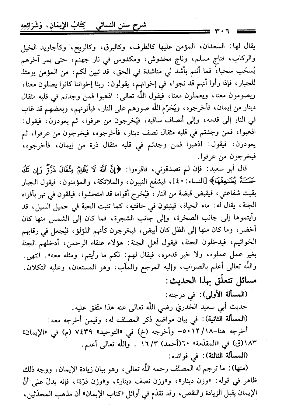 (منها): ما ترجم له المصنّف رحمه الله تعالى، وهو بيان زيادة الإيمان، ووجه ذلك ظاهر فِي قوله: "وزن دينار"، و"وزن نصف دينار"، و"وزن ذرّة"، فإنه يدلّ عَلَى أنَّ الإيمان يقبل الزيادة والنقص، وَقَدْ تقدّم فِي أوائل "كتاب الإيمان" أن مذهب المحدّثين،