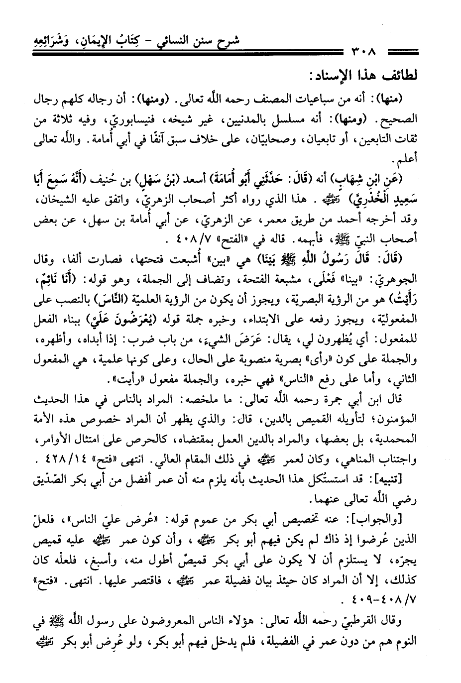 وَقَالَ القرطبيّ رحمه الله تعالى: هؤلاء النَّاس المعروضون عَلَى رسول الله -صلى الله عليه وسلم- فِي النوم هم منْ دون عمر فِي الفضيلة، فلم يدخل فيهم أبو بكر، ولو عُرِض أبو بكر -رضي الله عنه-