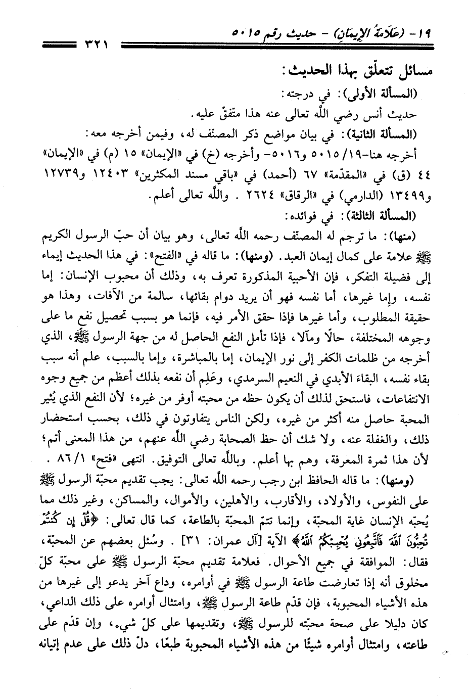 (منها): ما ترجم له المصنّف رحمه الله تعالى، وهو بيان أن حبّ الرسول الكريم -صلى الله عليه وسلم- علامة عَلَى كمال إيمان العبد. (ومنها): ما قاله فِي "الفتح": فِي هَذَا الْحَدِيث إيماء إلى فضيلة التفكر، فإن الأحبية المذكورة تعرف به، وذلك أن محبوب الإنسان: إما نفسه، وإما غيرها، أما نفسه فهو أن يريد دوام بقائها، سالمة منْ الآفات، وهذا هو حقيقة المطلوب، وأما غيرها فإذا حقق الأمر فيه، فإنما هو بسبب تحصيل نفع ما عَلَى وجوهه المختلفة، حالاً ومآلاً، فإذا تأمل النفع الحاصل له منْ جهة الرسول -صلى الله عليه وسلم-، الذي أخرجه منْ ظلمات الكفر إلى نور الإيمان، إما بالمباشرة، وإما بالسبب، علم أنه سبب بقاء نفسه، البقاءَ الأبدي فِي النعيم السرمدي، وعَلِم أن نفعه بذلك أعظم منْ جميع وجوه الانتفاعات، فاستحق لذلك أن يكون حظه منْ محبته أوفر منْ غيره؛ لأن النفع الذي يُثير المحبّة حاصل منه أكثر منْ غيره، ولكن النَّاس يتفاوتون فِي ذلك، بحسب استحضار ذلك، والغفلة عنه، ولا شك أن حظ الصحابة رضي الله عنهم، منْ هَذَا المعنى أتم؛ لأن هَذَا ثمرة المعرفة، وهم بها أعلم. وبالله تعالى التوفيق، انتهى "فتح" 1/ 86.