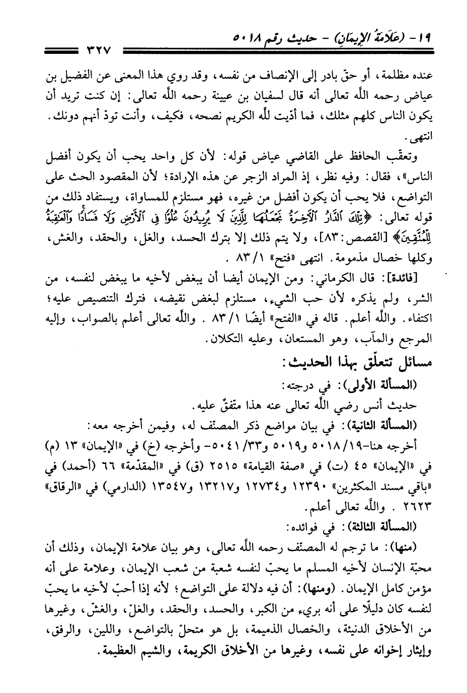 وتعقّب الحافظ عَلَى القاضي عياض قوله: لأن كل واحد يحب أن يكون أفضل النَّاس"، فَقَالَ: وفيه نظر، إذ المراد الزجر عن هذه الإرادة؛ لأن المقصود الحث عَلَى التواضع، فلا يحب أن يكون أفضل منْ غيره، فهو مستلزم للمساواة، ويستفاد ذلك منْ قوله تعالى: {تِلْكَ الدَّارُ الْآخِرَةُ نَجْعَلُهَا لِلَّذِينَ لَا يُرِيدُونَ عُلُوًّا فِي الْأَرْضِ وَلَا فَسَادًا وَالْعَاقِبَةُ لِلْمُتَّقِينَ} [القصص: 83]، ولا يتم ذلك إلا بترك الحسد، والغل، والحقد، والغش، وكلها خصال مذمومة. انتهى "فتح" 1/ 83.
