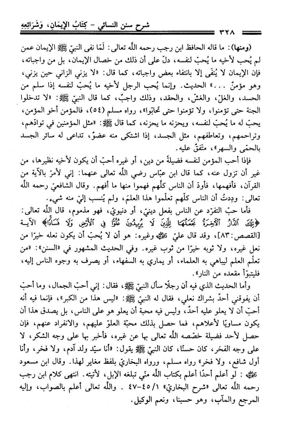 (ومنها): ما قاله الحافظ ابن رَجَب رحمه الله تعالى: لَمّا نفى النبيّ -صلى الله عليه وسلم- الإيمان عمن لم يُحب لأخيه ما يُحبّ لنفسه، دلّ عَلَى أن ذلك منْ خصال الإيمان، بل منْ واجباته، فإن الإيمان لا يُنفَى إلا بانتفاء بعض واجباته، كما قَالَ: "لا يزني الزاني حين يزني، وهو مؤمنٌ ... " الْحَدِيث. وإنما يُحب الرجل لأخيه ما يُحبّ لنفسه إذا سلم منْ الحسد، والغلّ، والغشّ، والحقد، وذلك واجبٌ، كما قَالَ النبيّ -صلى الله عليه وسلم-: "لا تدخلو الجنة حَتَّى تؤمنوا، ولا تؤمنوا حَتَّى تحابّوا"، رواه مسلم (54)، فالمؤمن أخو المؤمن، يحبّ له ما يُحبّ لنفسه، ويحزنه ما يحزنه، كما قَالَ -صلى الله عليه وسلم-: "مثل المؤمنين فِي توادّهم، وتراحمهم، وتعاطفهم، مثل الجسد، إذا اشتكى منه عضوٌ، تداعى له سائر الجسد بالحمّى والسهر"، متّفقٌ عليه.