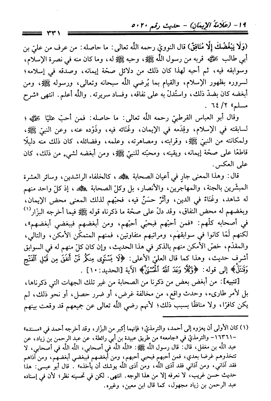 وَقَالَ أبو العبّاس القرطبيّ رحمه الله تعالى: ما حاصله: فمن أحب عُليًا -رضي الله عنه-؛ لسابقته فِي الإسلام، وقِدَمه فِي الإيمان، وغَنَائه فيه، وذَوْده عنه، وعن النبيّ -صلى الله عليه وسلم-، ولمكانته منْ النبيّ -صلى الله عليه وسلم-، وقرابته، ومصاهرته، وعلمه، وفضائله، كَانَ ذلك منه دليلاً قاطعًا عَلَى صحة إيمانه، ويقينه، ومحبّته للنبيّ -صلى الله عليه وسلم-، ومن أبغضه لشيء منْ ذلك، كَانَ عَلَى العكس.