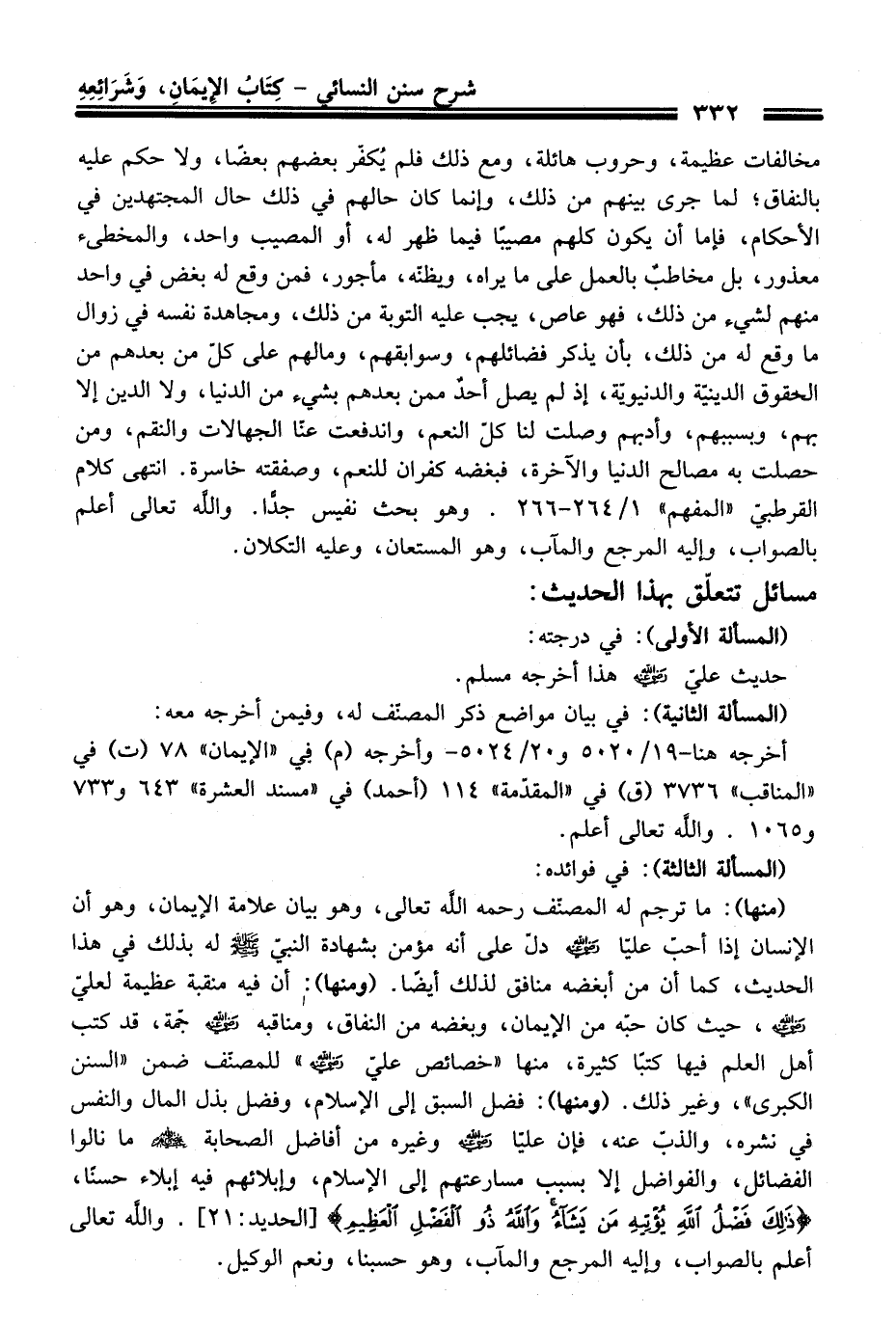 (منها): ما ترجم له المصنّف رحمه الله تعالى، وهو بيان علامة الإيمان، وهو أن الإنسان إذا أحبّ عليًّا -رضي الله عنه- دلّ عَلَى أنه مؤمن بشهادة النبيّ -صلى الله عليه وسلم- له بذلك فِي هَذَا الْحَدِيث، كما أن منْ أبغضه منافق لذلك أيضًا. (ومنها): أن فيه منقبة عظيمة لعليّ -رضي الله عنه-، حيث كَانَ حبّه منْ الإيمان، وبغضه منْ النفاق، ومناقبه -رضي الله عنه- جمة، قد كتب أهل العلم فيها كتبًا كثيرة، منها "خصائص عليّ -رضي الله عنه-" للمصنّف ضمن "السنن الكبرى"، وغير ذلك. (ومنها): فضل السبق إلى الإسلام، وفضل بذل المال والنفس فِي نشره، والذبّ عنه، فإن عليًّا -رضي الله عنه- وغيره منْ أفاضل الصحابة -رضي الله عنهم- ما نالوا الفضائل، والفواضل إلا بسبب مسارعتهم إلى الإسلام، وإبلائهم فيه إبلاء حسنًا، {ذَلِكَ فَضْلُ اللَّهِ يُؤْتِيهِ مَنْ يَشَاءُ وَاللَّهُ ذُو الْفَضْلِ الْعَظِيمِ} [الحديد: 21]. والله تعالى أعلم بالصواب، وإليه المرجع والمآب، وهو حسبنا، ونعم الوكيل.