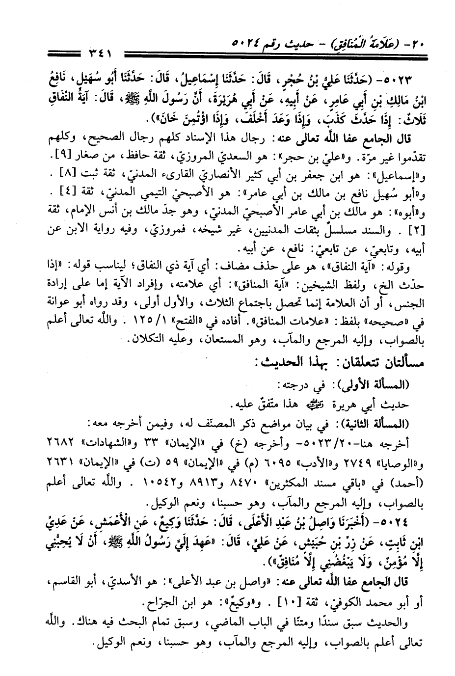 5023 - (حَدَّثَنَا عَلِيُّ بْنُ حُجْرٍ، قَالَ: حَدَّثَنَا إِسْمَاعِيلُ، قَالَ: حَدَّثَنَا أَبُو سُهَيْلٍ، نَافِعُ بْنُ مَالِكِ بْنِ أَبِي عَامِرٍ، عَنْ أَبِيهِ، عَنْ أَبِي هُرَيْرَةَ، أَنَّ رَسُولَ اللَّهِ -صلى الله عليه وسلم-، قَالَ: "آيَةُ النِّفَاقِ ثَلاَثٌ: إِذَا حَدَّثَ كَذَبَ، وَإِذَا وَعَدَ أَخْلَفَ، وَإِذَا ائْتُمِنَ خَانَ").