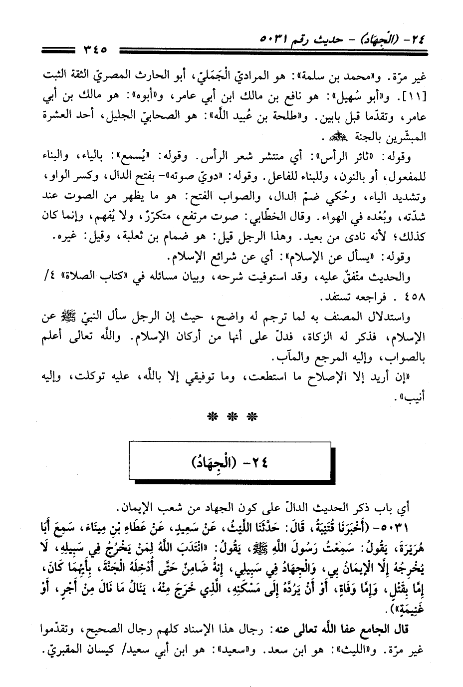 غير مرّة. و"محمد بن سلمة": هو المراديّ الْجَمَليّ، أبو الحارث المصريّ الثقة الثبت [11]. و"أبو سُهيل": هو نافع بن مالك ابن أبي عامر، و"أبوه": هو مالك بن أبي عامر، وتقدّما قبل بابين. و"طلحة بن عُبيد الله": هو الصحابيّ الجليل، أحد العشرة المبشّرين بالجنة -رضي الله عنهم-.