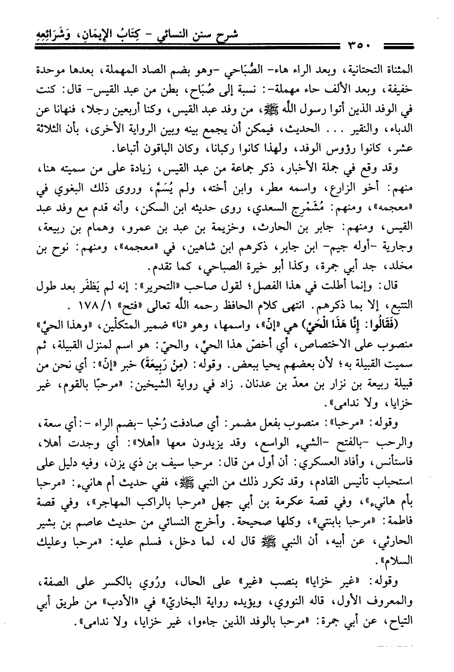 (فَقَالُوا: إِنَّا هَذَا الْحَيَّ) هي "إنّ"، واسمها، وهو "نا" ضمير المتكلّمين، "وهذا الحيَّ" منصوب عَلَى الاختصاص، أي أخصّ هَذَا الحيَّ، والحيّ: هو اسم لمنزل القبيلة، ثم سميت القبيلة به؛ لأن بعضهم يحيا ببعض. وقوله: (مِن رَبيعَةَ) خبر "إنّ": أي نحن منْ قبيلة ربيعة بن نزار بن معدّ بن عدنان. زاد فِي رواية الشيخين: "مرحبًا بالقوم، غير خزايا، ولا ندامى".