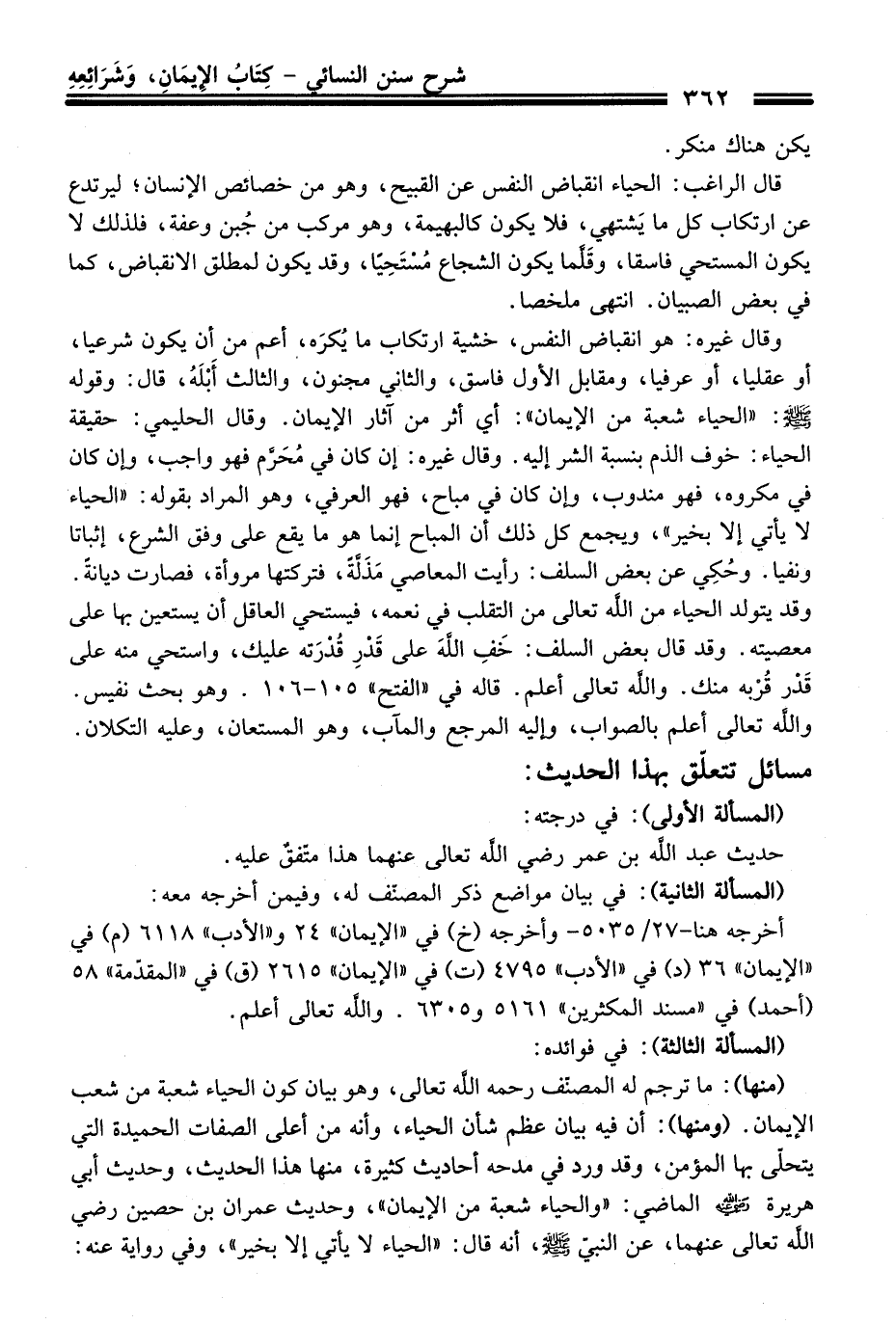 وَقَالَ غيره: هو انقباض النفس، خشية ارتكاب ما يُكرَه، أعم منْ أن يكون شرعيا، أو عقليا، أو عرفيا، ومقابل الأول فاسق، والثاني مجنون، والثالث أَبْلَهُ، قَالَ: وقوله -صلى الله عليه وسلم-: "الحياء شعبة منْ الإيمان": أي أثر منْ آثار الإيمان. وَقَالَ الحليمي: حقيقة الحياء: خوف الذم بنسبة الشر إليه. وَقَالَ غيره: إن كَانَ فِي مُحَرَّم فهو واجب، وإن كَانَ فِي مكروه، فهو مندوب، وإن كَانَ فِي مباح، فهو العرفي، وهو المراد بقوله: "الحياء لا يأتي إلا بخير"، ويجمع كل ذلك أن المباح إنما هو ما يقع عَلَى وفق الشرع، إثباتا ونفيا. وحُكِي عن بعض السلف: رأيت المعاصي مَذَلَّةً، فتركتها مروأة، فصارت ديانةً. وَقَدْ يتولد الحياء منْ الله تعالى منْ التقلب فِي نعمه، فيستحي العاقل أن يستعين بها عَلَى معصيته. وَقَدْ قَالَ بعض السلف: خَفِ اللهَ عَلَى قَدْرِ قُدْرَته عليك، واستحي منه عَلَى قَدْر قُرْبه منك. والله تعالى أعلم. قاله فِي "الفتح" 105 - 106. وهو بحث نفيس. والله تعالى أعلم بالصواب، وإليه المرجع والمآب، وهو المستعان، وعليه التكلان.