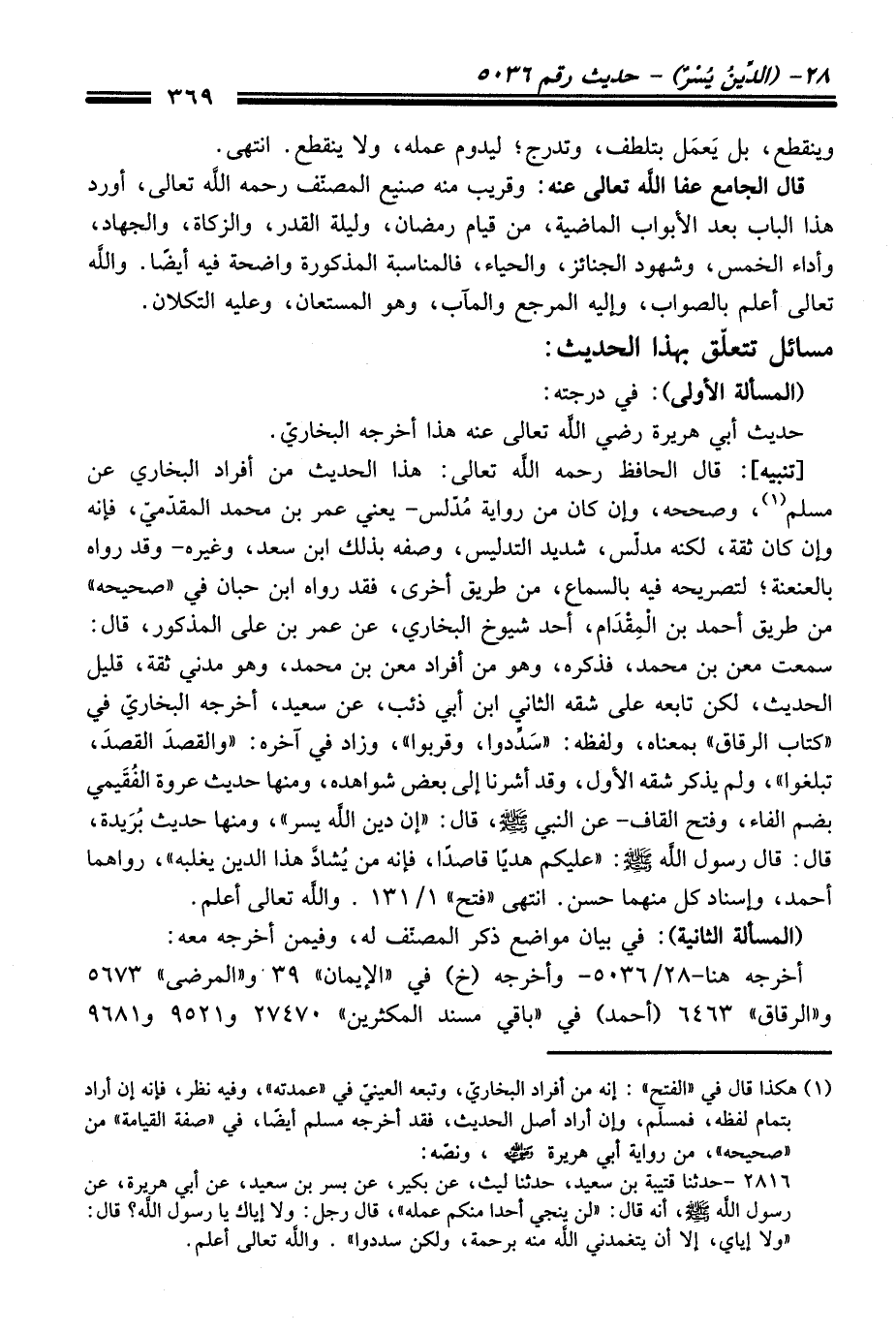 [تنبيه]: قَالَ الحافظ رحمه الله تعالى: هَذَا الْحَدِيث منْ أفراد البخاريّ عن مسلم (¬1)، وصححه، وإن كَانَ منْ رواية مُدّلس -يعني عمر بن محمد المقدّميّ، فإنه وإن كَانَ ثقة، لكنه مدلّس، شديد التدليس، وصفه بذلك ابن سعد، وغيره- وَقَدْ رواه بالعنعنة؛ لتصريحه فيه بالسماع، منْ طريق أخرى، فقد رواه ابن حبّان فِي "صحيحه" منْ طريق أحمد بن الْمِقْدَام، أحد شيوخ البخاريّ، عن عمر بن عَلَى المذكور، قَالَ: سمعت معن بن محمد، فذكره، وهو منْ أفراد معن بن محمد، وهو مدني ثقة، قليل الْحَدِيث، لكن تابعه عَلَى شقه الثاني ابن أبي ذئب، عن سعيد، أخرجه البخاريّ فِي "كتاب الرقاق" بمعناه، ولفظه: "سَدِّدوا، وقربوا"، وزاد فِي آخره: "والقصدَ القصدَ، تبلغوا"، ولم يذكر شقه الأول، وَقَدْ أشرنا إلى بعض شواهده، ومنها حديث عروة الفُقَيمي بضم الفاء، وفتح القاف- عن النبيّ -صلى الله عليه وسلم-، قَالَ: "إن دين الله يسر"، ومنها حديث بُرَيدة، قَالَ: قَالَ رسول الله -صلى الله عليه وسلم-: "عليكم هديًا قاصدًا، فإنه منْ يُشادَّ هَذَا الدين يغلبه"، رواهما أحمد، وإسناد كل منهما حسن. انتهى "فتح" 1/ 131. والله تعالى أعلم.