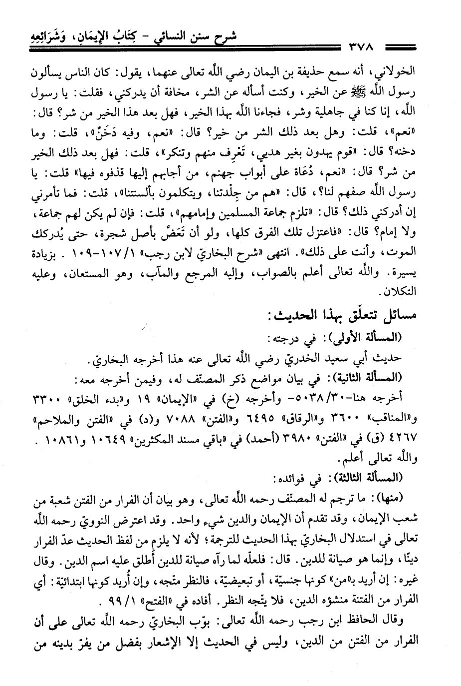 الخولاني، أنه سمع حذيفة بن اليمان رضي الله تعالى عنهما، يقول: كَانَ النَّاس يسألون رسول الله -صلى الله عليه وسلم- عن الخير، وكنت أسأله عن الشر، مخافة أن يدركني، فقلت: يا رسول الله، إنا كنا فِي جاهلية وشر، فجاءنا الله بهذا الخير، فهل بعد هَذَا الخير منْ شر؟ قَالَ: "نعم"، قلت: وهل بعد ذلك الشر منْ خير؟ قَالَ: "نعم، وفيه دَخَنٌ"، قلت: وما دخنه؟ قَالَ: "قوم يهدون بغير هديي، تَعْرِف منهم وتنكر"، قلت: فهل بعد ذلك الخير منْ شر؟ قَالَ: "نعم، دُعاة عَلَى أبواب جهنم، منْ أجابهم إليها قذفوه فيها" قلت: يا رسول الله صفهم لنا؟، قَالَ: "هم منْ جِلدتنا، ويتكلمون بألسنتنا"، قلت: فما تأمرني إن أدركني ذلك؟ قَالَ: "تلزم جماعة المسلمين وإمامهم"، قلت: فإن لم يكن لهم جماعة، ولا إمام؟ قَالَ: "فاعتزل تلك الفرق كلها، ولو أن تَعَضَّ بأصل شجرة، حَتَّى يُدركك الموت، وأنت عَلَى ذلك". انتهى "شرح البخاريّ لابن رَجَب" 1/ 107 - 109. بزيادة يسيرة. والله تعالى أعلم بالصواب، وإليه المرجع والمآب، وهو المستعان، وعليه التكلان.