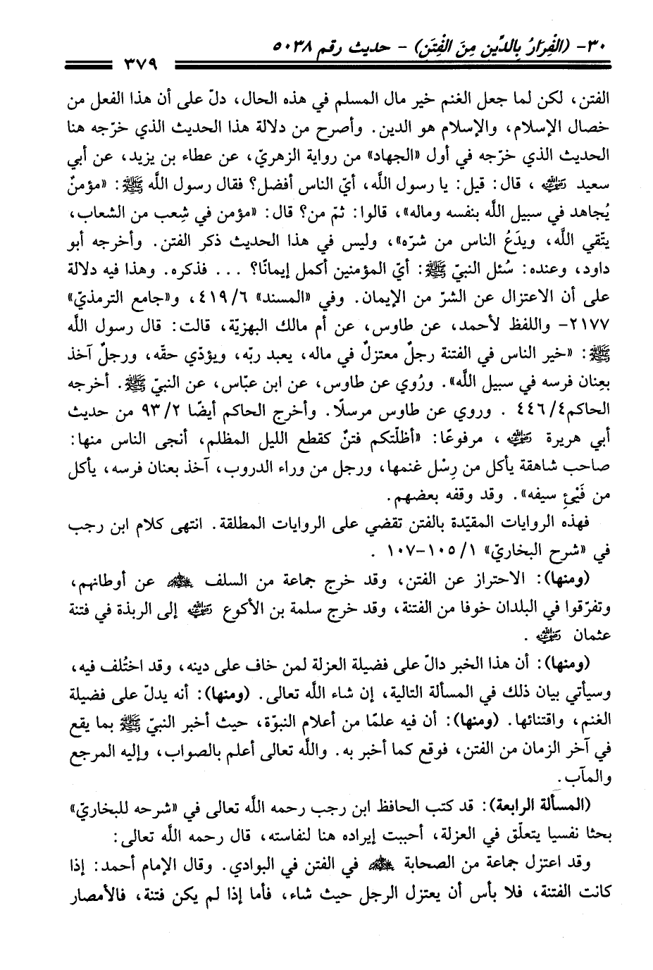 الفتن، لكن لما جعل الغنم خير مال المسلم فِي هذه الحال، دلّ عَلَى أن هَذَا الفعل منْ خصال الإسلام، والإسلام هو الدين. وأصرح منْ دلالة هَذَا الْحَدِيث الذي خرّجه هنا الْحَدِيث الذي خرّجه فِي أول "الجهاد" منْ رواية الزهريّ، عن عطاء بن يزيد، عن أبي سعيد -رضي الله عنه-، قَالَ: قيل: يا رسول الله، أي النَّاس أفضل؟ فَقَالَ رسول الله -صلى الله عليه وسلم-: "مؤمنٌ يُجاهد فِي سبيل الله بنفسه وماله"، قالوا: ثمّ منْ؟ قَالَ: "مؤمن فِي شِعب منْ الشعاب، يتقي الله، ويدَعُ النَّاس منْ شره"، وليس فِي هَذَا الْحَدِيث ذكر الفتن. وأخرجه أبو داود، وعنده: سُئل النبيّ -صلى الله عليه وسلم-: أيّ المؤمنين أكمل إيمانًا؟ ... فذكره. وهذا فيه دلالة عَلَى أن الاعتزال عن الشرّ منْ الإيمان. وفي "المسند" 6/ 419، و"جامع الترمذيّ":