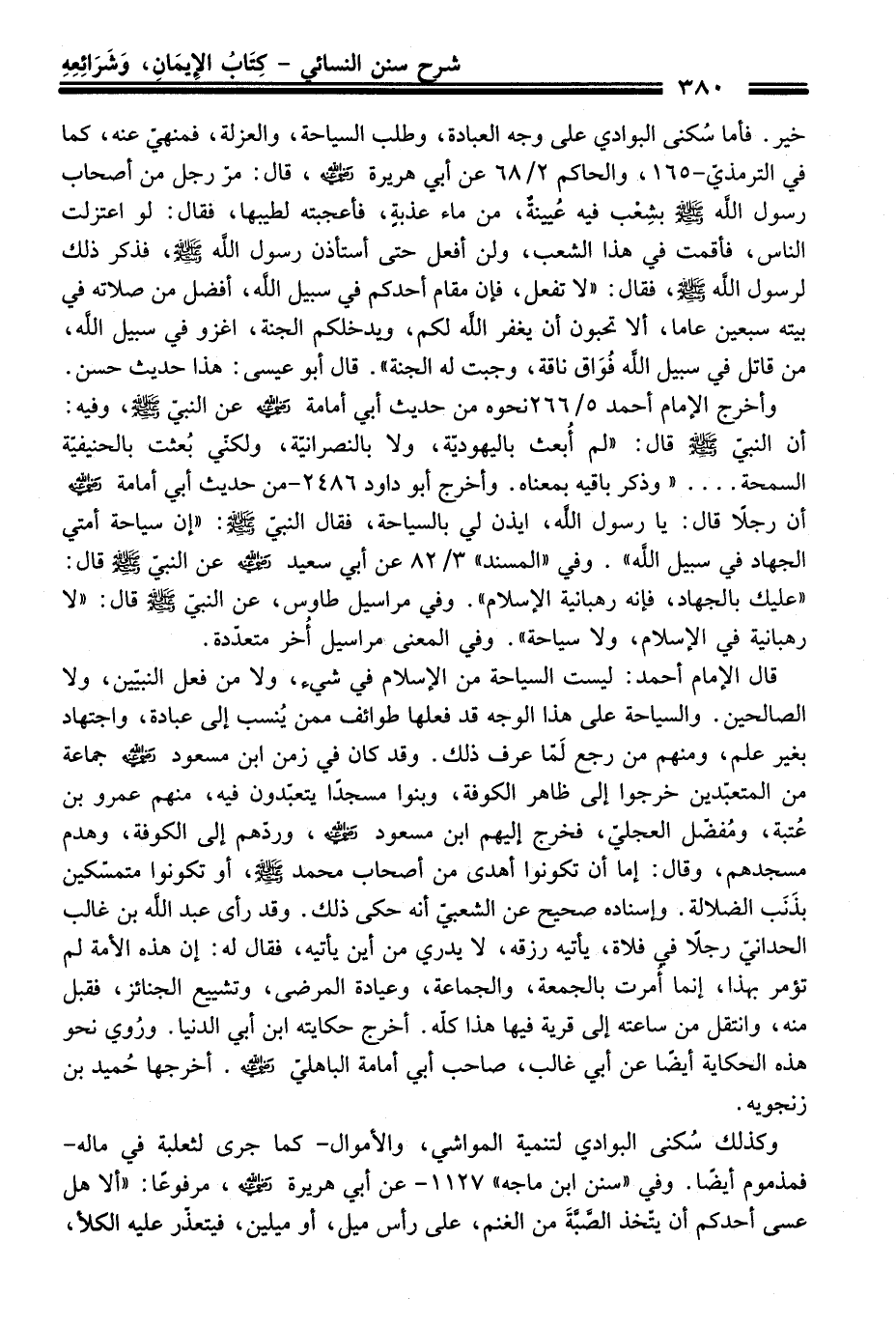 قَالَ الإمام أحمد: ليست السياحة منْ الإسلام فِي شيء، ولا منْ فعل النبيّين، ولا الصالحين. والسياحة عَلَى هَذَا الوجه قد فعلها طوائف ممن يُنسب إلى عبادة، واجتهاد بغير علم، ومنهم منْ رجع لَمّا عرف ذلك. وَقَدْ كَانَ فِي زمن ابن مسعود -رضي الله عنه- جماعة منْ المتعبّدين خرجوا إلى ظاهر الكوفة، وبنوا مسجدًا يتعبّدون فيه، منهم عمرو بن عُتبة، ومُفضّل العجليّ، فخرج إليهم ابن مسعود -رضي الله عنه-، وردّهم إلى الكوفة، وهدم مسجدهم، وَقَالَ: إما أن تكونوا أهدى منْ أصحاب محمد -صلى الله عليه وسلم-، أو تكونوا متسمكين بذَنَب الضلالة. وإسناده صحيح عن الشعبيّ أنه حكى ذلك. وَقَدْ رأى عبد الله بن غالب الحدانيّ رجلاً فِي فلاة، يأتيه رزقه، لا يدري منْ أين يأتيه، فَقَالَ له: إن هذه الأمة لم تؤمر بهذا، إنما أمرت بالجمعة، والجماعة، وعيادة المرضى، وتشييع الجنائز، فقبل منه، وانتقل منْ ساعته إلى قرية فيها هَذَا كلّه. أخرج حكايته ابن أبي الدنيا. ورُوي نحو هذه الحكاية أيضًا عن أبي غالب، صاحب أبي أمامة الباهليّ -رضي الله عنه-. أخرجها حُميد بن زنجويه.
