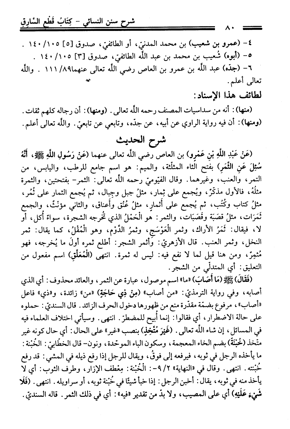 (عَنْ عَبْدِ اللَّهِ بْنِ عَمْرٍو) بن العاص رضي الله تعالى عنهما (عَنْ رَسُولِ اللَّهِ -صلى الله عليه وسلم-، أَنَّهُ سُئِلَ عَنِ الثَّمَرِ) بفتح الثاء المثلّثة، والميم: هو اسم جامع للرطب، واليابس، منْ التمر، والعنب، وغيرهما. وَقَالَ الفيّوميّ رحمه الله تعالى: الثمر -بفتحتين، والثمرة مثلُهُ، فالأول مذكّرٌ، ويُجمع عَلَى ثِمار، مثلُ جبل وجِبال، ثم يُجمع الثمار عَلَى ثُمُر، مثلُ كتاب وكُتُب، ثم يُجمع عَلَى أَثمارٍ، مثلُ عُنُق وأَعناق، والثاني مؤنّثٌ، والجمع ثَمَرَات، مثلُ قصَبَة وقَصَبَات، والثمر: هو الْحَمْلُ الذي تُخرجه الشجرة، سواءٌ أُكل، أو لا، فيقال: ثَمَرُ الأراك، وثمر الْعَوْسَجِ، وثمرُ الدَّوْم، وهو الْمُقْلُ، كما يقال: ثمر النخل، وثمر العنب. قَالَ الأزهريّ: وأثمر الشجر: أطلع ثمره أولَ ما يُخرجه، فهو مُثمِرٌ، ومن هنا قيل لما لا نفع فيه: ليس له ثمرة. انتهى (الْمُعَلَّقِ) اسم مفعول منْ التعليق: أي المتدلّي منْ الشجر.