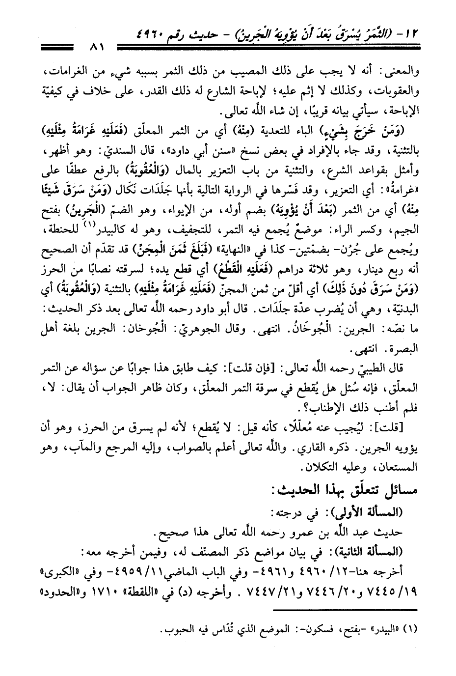 [قلت]: ليُجيب عنه مُعلْلاً، كأنه قيل: لا يُقطع؛ لأنه لم يسرق منْ الحرز، وهو أن يؤويه الجرين. ذكره القاري. والله تعالى أعلم بالصواب، وإليه المرجع والمآب، وهو المستعان، وعليه التكلان.