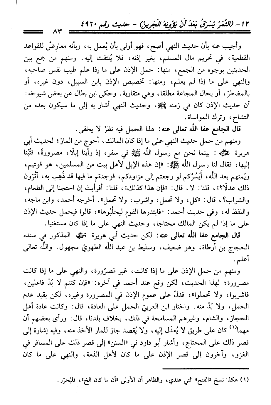 ومنهم منْ حمل حديث النهي عَلَى ما إذا كَانَ المالك، أحوج منْ المارّ؛ لحديث أبي هريرة -رضي الله عنه-: بينما نحن مع رسول الله -صلى الله عليه وسلم- فِي سفر، إذ رأينا إبلاً، مصرورةً، فثُبْنا إليها، فَقَالَ لنا رسول الله -صلى الله عليه وسلم-: "إن هذه الإبل لأهل بيت منْ المسلمين، هو قوتهم، ويُمنهم بعد الله، أَيَسُرُّكم لو رجعتم إلى مزاودكم، فوجدتم ما فيها قد ذُهِب به، أتُرَون ذلك عدلاً؟ "، قلنا: لا، قَالَ: "فإن هَذَا كذلك"، قلنا: أفرأيتَ إن احتجنا إلى الطعام، والشراب؟، قَالَ: "كل، ولا تحمل، واشرب، ولا تحمل". أخرجه أحمد، وابن ماجه، واللفظ له، وفي حديث أحمد: "فابتدرها القوم ليحلُبُوها"، قالوا فيحمل حديث الإذن عَلَى ما إذا لم يكن المالك محتاجا، وحديث النهي عَلَى ما إذا كَانَ مستغنيا.