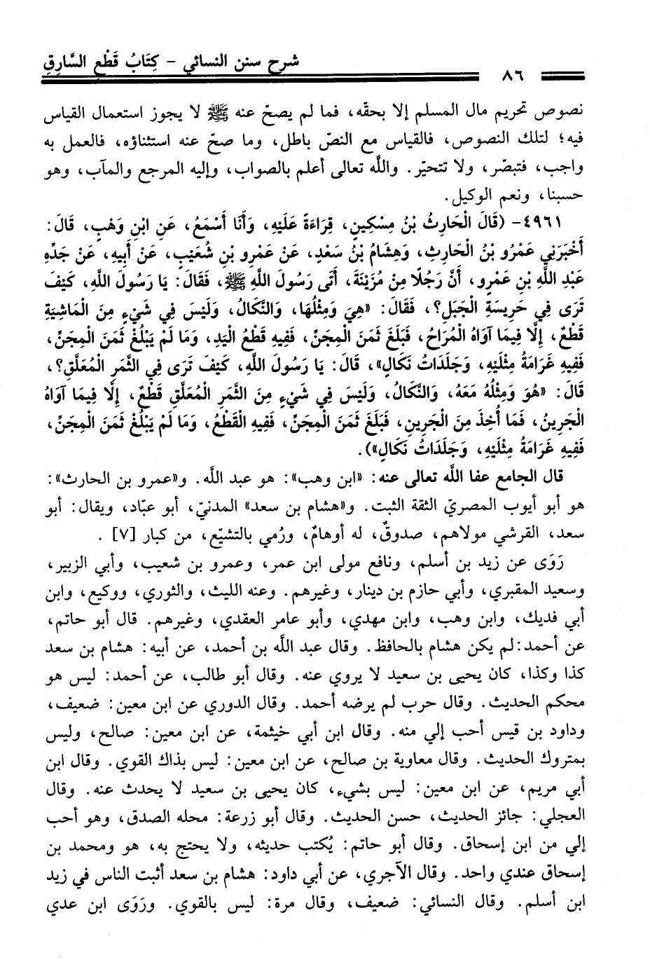 4961 - (قَالَ الْحَارِثُ بْنُ مِسْكِينٍ، قِرَاءَةً عَلَيْهِ، وَأَنَا أَسْمَعُ، عَنِ ابْنِ وَهْبٍ، قَالَ: أَخْبَرَنِي عَمْرُو بْنُ الْحَارِثِ، وَهِشَامُ بْنُ سَعْدٍ، عَنْ عَمْرِو بْنِ شُعَيْبٍ، عَنْ أَبِيهِ، عَنْ جَدِّهِ عَبْدِ اللَّهِ بْنِ عَمْرٍو، أَنَّ رَجُلاً مِنْ مُزَيْنَةَ، أَتَى رَسُولَ اللَّهِ -صلى الله عليه وسلم-، فَقَالَ: يَا رَسُولَ اللَّهِ، كَيْفَ تَرَى فِي حَرِيسَةِ الْجَبَلِ، فَقَالَ: "هِيَ وَمِثْلُهَا، وَالنَّكَالُ، وَلَيْسَ فِي شَيْءٍ مِنَ الْمَاشِيَةِ قَطْعٌ، إِلاَّ فِيمَا آوَاهُ الْمُرَاحُ، فَبَلَغَ ثَمَنَ الْمِجَنِّ، فَفِيهِ قَطْعُ الْيَدِ، وَمَا لَمْ يَبْلُغْ ثَمَنَ الْمِجَنِّ، فَفِيهِ غَرَامَةُ مِثْلَيْهِ، وَجَلَدَاتُ نَكَالٍ"، قَالَ: يَا رَسُولَ اللَّهِ، كَيْفَ تَرَى فِي الثَّمَرِ الْمُعَلَّقِ؟ قَالَ: "هُوَ وَمِثْلُهُ مَعَهُ، وَالنَّكَالُ، وَلَيْسَ فِي شَيْءٍ مِنَ الثَّمَرِ الْمُعَلَّقِ قَطْعٌ، إِلاَّ فِيمَا آوَاهُ الْجَرِينُ، فَمَا أُخِذَ مِنَ الْجَرِينِ، فَبَلَغَ ثَمَنَ الْمِجَنِّ، فَفِيهِ الْقَطْعُ، وَمَا لَمْ يَبْلُغْ ثَمَنَ الْمِجَنِّ، فَفِيهِ غَرَامَةُ مِثْلَيْهِ، وَجَلَدَاتُ نَكَالٍ").